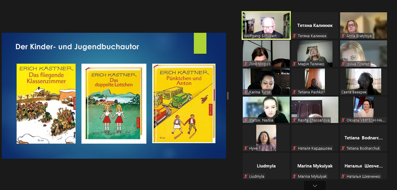 Присутні ознайомилися із життєвим і творчим шляхом відомого німецького автора дитячих та юнацьких творів Еріха Кестнера. Пан Schubert майстерно висвітлив проблематику його творів «Emil und Detektive», «Das fliegende Klassenzimmer», «Pünktchen und Anton», «Das doppelte Lottchen», охарактеризував їх героїв. Наразі, Вікторія Предиткевич працює над дипломною роботою, яка зорієнтована на вивчення можливостей використання творів Еріха Кестнера на уроках німецької мови з метою формування іншомовної компетентності в читанні.