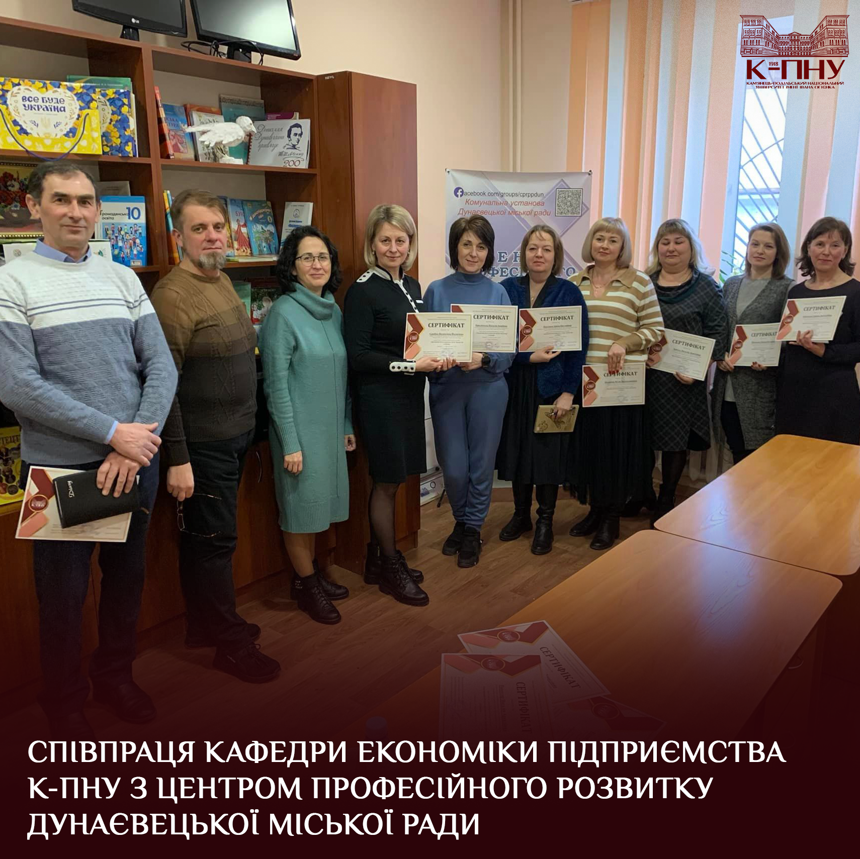 8-9 березня в межах співпраці Кам’янець-Подільського національного університету імені Івана Огієнка з КУ ДМР «Центр професійного розвитку педагогічних працівників» науково-педагогічні працівники кафедри економіки підприємства (завідувач кафедри економіки підприємства, доктор економічних наук, професор Наталія Мазур, декан природничо-економічного факультету, кандидат економічних наук, доцент Іван Семенець, кандидат економічних наук, доцент Андрій Ніколашин) провели науково-практичний семінар для бухгалтерів відділу фінансово-господарського забезпечення закладів освіти управління освіти, молоді та спорту Дунаєвецької міської ради за програмою «Організація бухгалтерського обліку бюджетної установи».