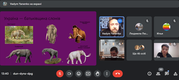 Вадим Олександрович продемонстрував експонати відділу палеонтології Національного науково-природничого музею НАН України, розповів цікаві факти про їх відкриття. Присутні дізналися, що на території України виявлено величезну кількість палеонтологічних знахідок різних періодів геологічної історії Землі – предків сучасних видів рептилій, плазунів, ссавців тощо; у нас жили предки сучасних слонів, ведмедів, оленів, носорогів.