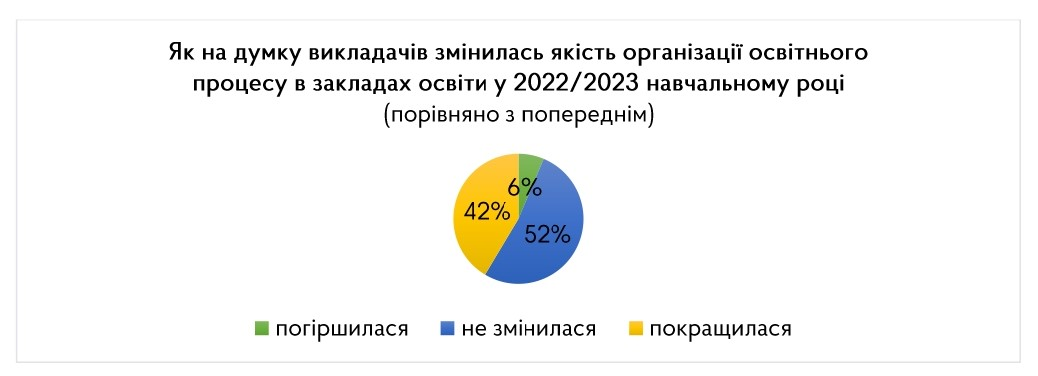 Половина респондентів з числа педагогічних і науково-педагогічних працівників (52%) вважають, що рівень якості освітніх послуг не змінився порівняно з І півріччям 2022-2023 н. р., натомість 42% з них визнали покращення. Про погіршення якості організації освітнього процесу заявили лише 6% викладачів.