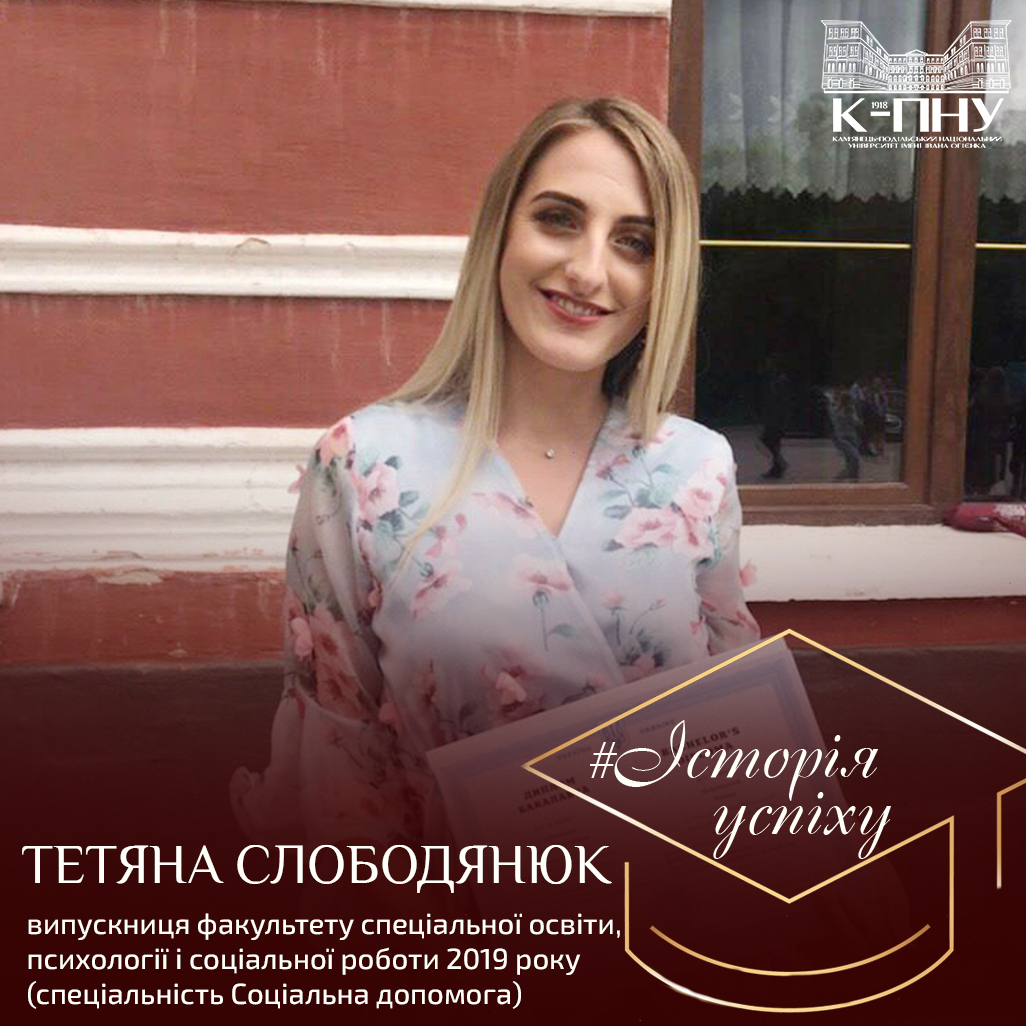 Тетяна Слободянюк випускниця факультету спеціальної освіти, психології і соціальної роботи 2019 року (спеціальність Соціальна допомога). Очолює відділ соціального захисту населення Лопушненської сільської ради (Кременецький район, Тернопільська область).