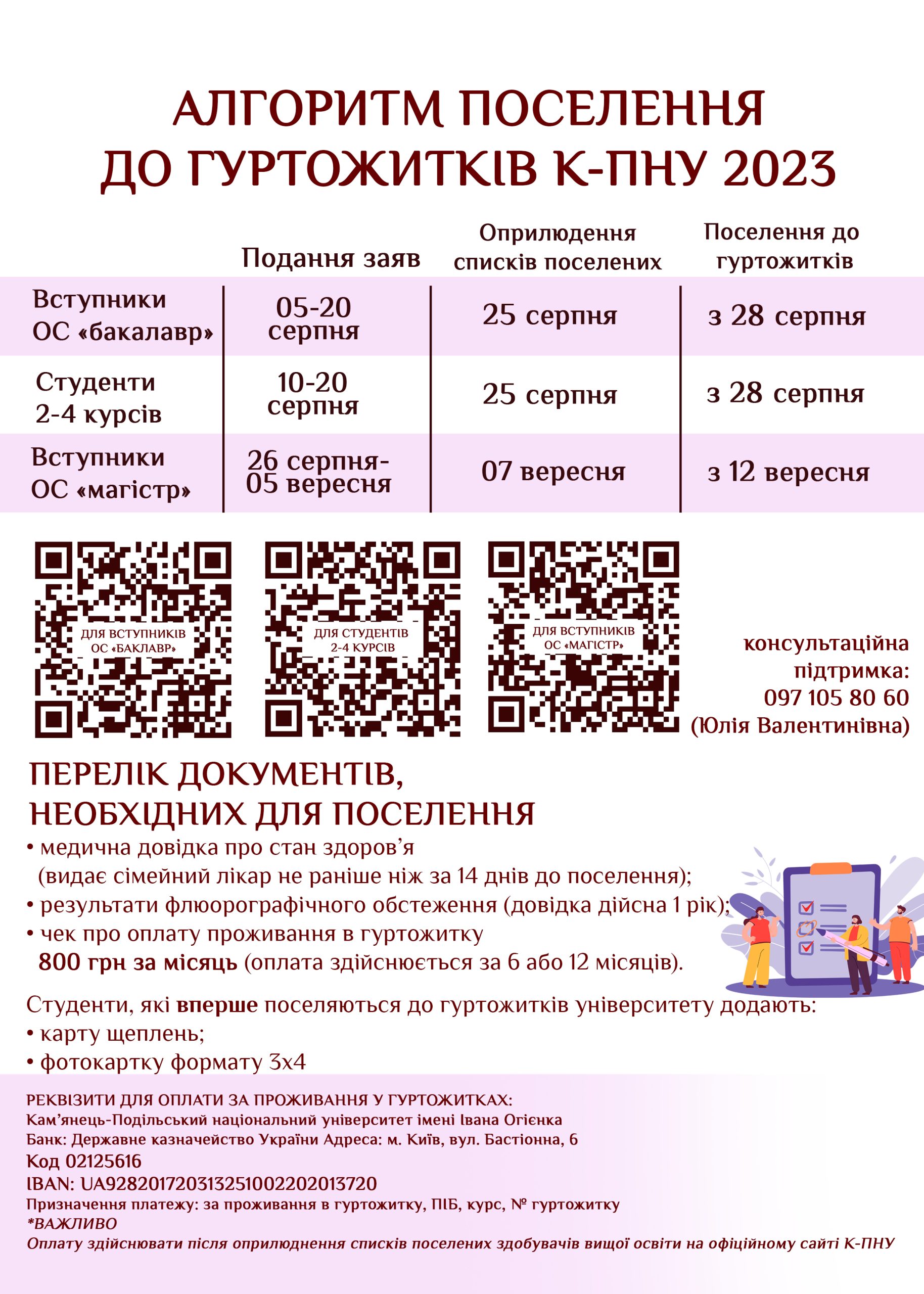 Оплату здійснювати після оприлюднення списків поселених здобувачів вищої освіти на офіційному сайті К-ПНУ (25 серпня – студенти 1 курсу ОС “бакалавр”).