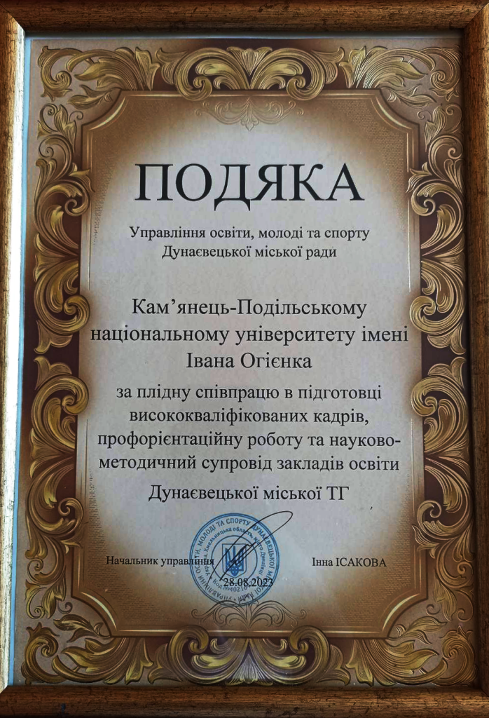 Також Управління освіти, молоді та спорту Дунаєвецької міської ради вручило Кам’янець-Подільському національному університету імені Івана Огієнка подяку за плідну співпрацю в підготовці висококваліфікованих кадрів, профорієнтаційну роботу та науково-методичний супровід закладів освіти Дунаєвецької міської ТГ.