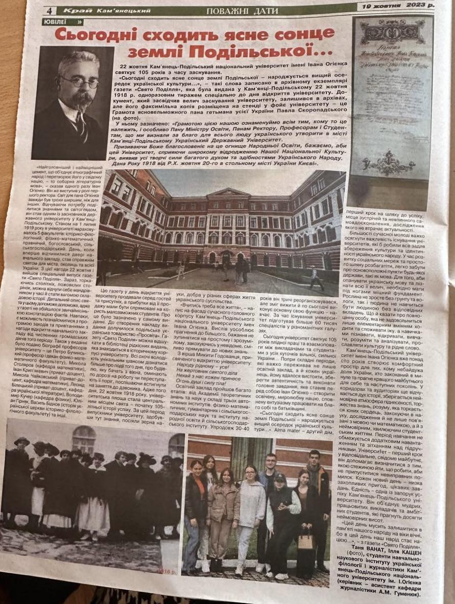 22 жовтня Кам’янець-Подільський національний університет імені Івана Огієнка святкував 105-річчя з Дня заснування. «Сьогодні сходить ясне сонце землі Подільської – народжується вищий осередок української культури…», – такі слова записано в архівному екземплярі газети «Свято Поділля», яка була видана у Кам’янці-Подільському 22 жовтня 1918 р. одноразовим тиражем спеціально до дня відкриття університету. Документ, який засвідчив велич заснування університету, залишився в архівах, але його факсимільна копія розміщена на стенді у фоє університету – це Грамота ясновельможного пана гетьмана усієї України Павла Скоропадського.