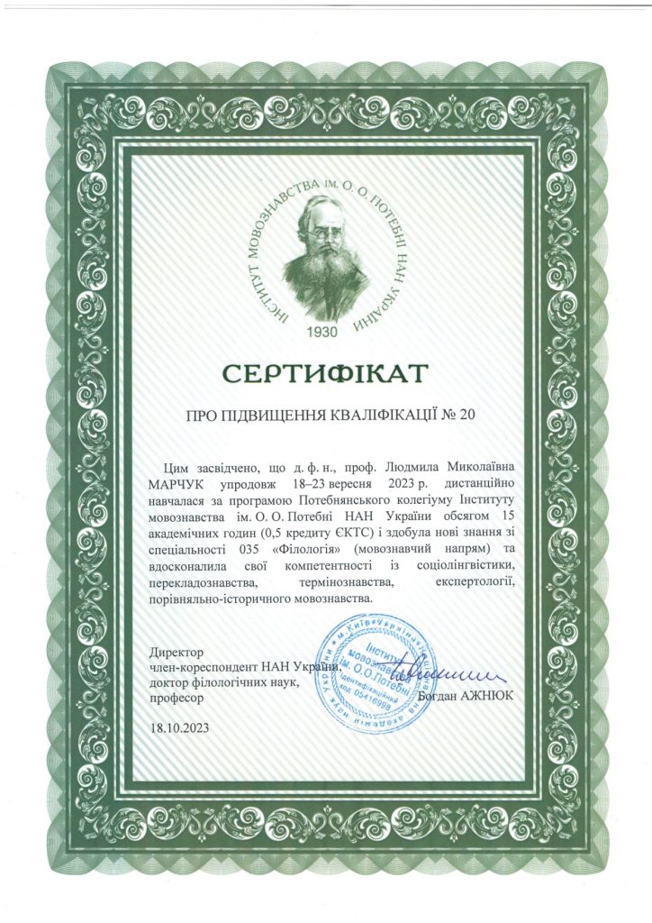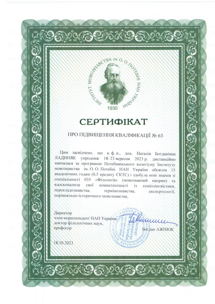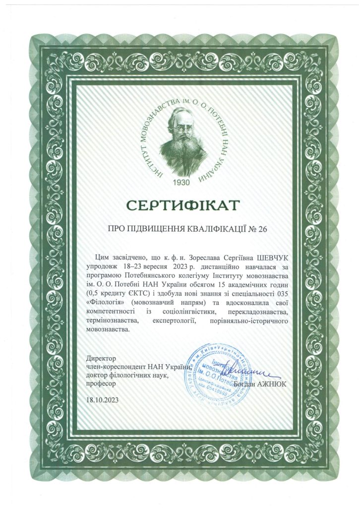 Упродовж 18-22 вересня 2023 року тривала робота ПОТЕБНЯНСЬКОГО КОЛЕГІУМУ – п’ятиденної лінгвістичної школи, мета якої – ознайомити всіх зацікавлених осіб з останніми здобутками мовознавчої науки. Організатор підвищення кваліфікації – Інститут мовознавства ім. О. О. Потебні НАН України.