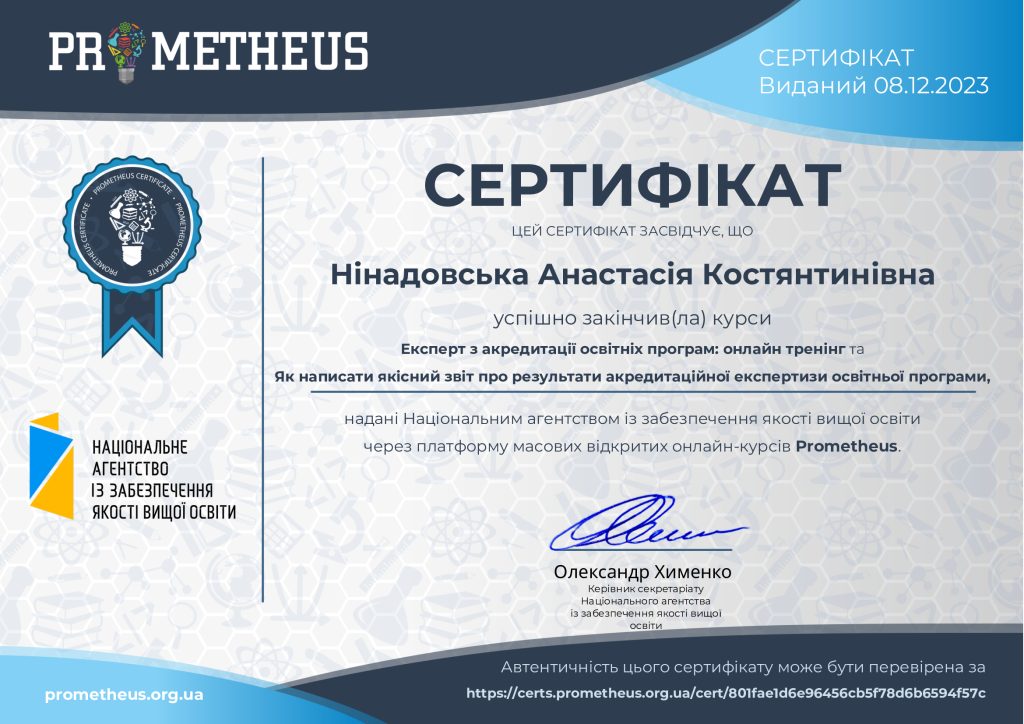 Анастасія успішно опанувала освітні курси «Експерт з акредитації освітніх програм: онлайн-тренінг» та «Як написати якісний звіт про результати акредитаційної експертизи освітньої програми», розташовані на платформі масових відкритих онлайнових курсів Prometheus, і взяла участь у тренінгу для експертів із написання звіту про результати акредитаційної експертизи.