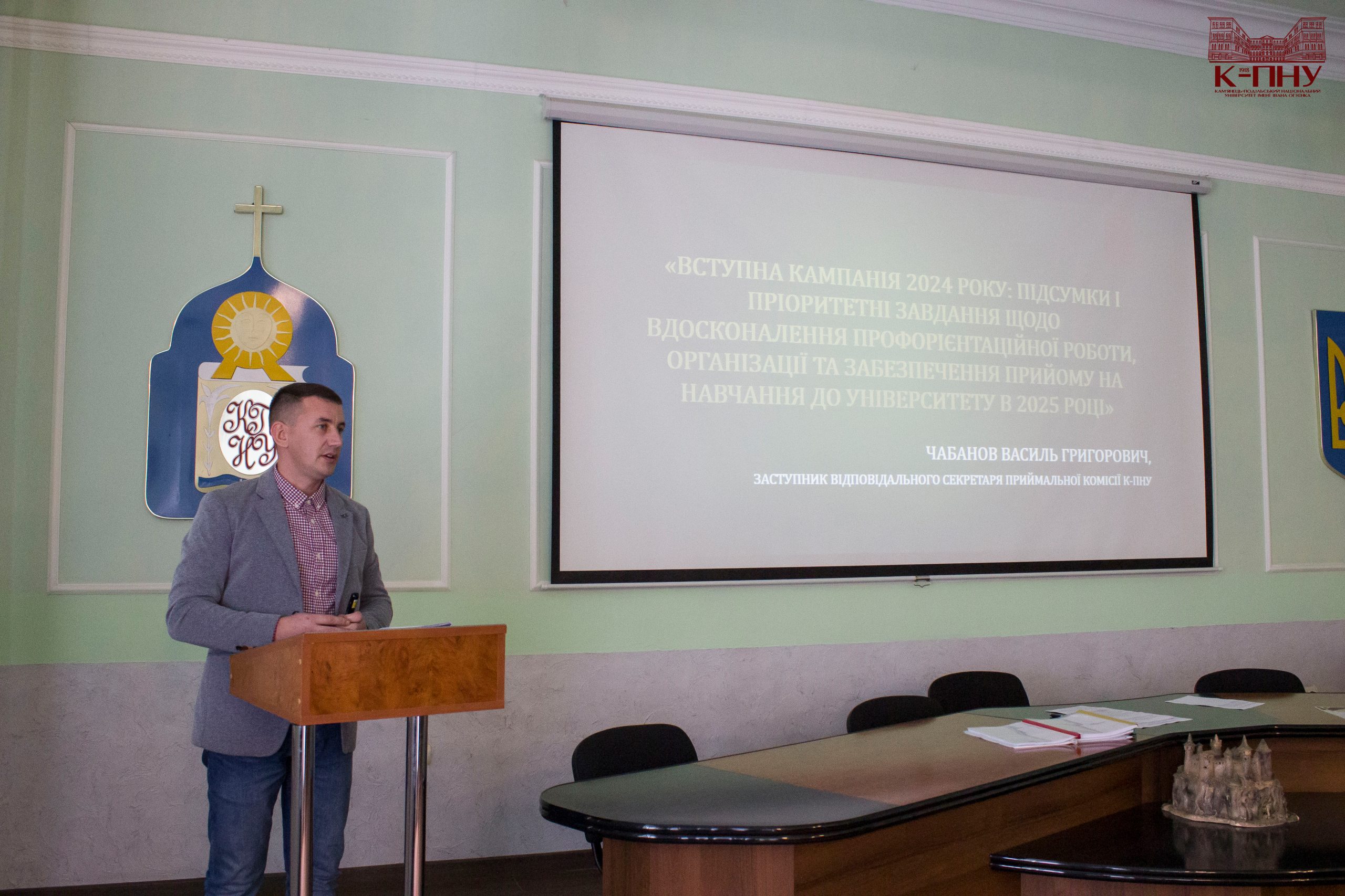 Заступник відповідального секретаря приймальної комісії Василь Чабанов доповів про результати вступної кампанії 2024 року й окреслив пріоритетні завдання щодо організації та забезпечення прийому на навчання до університету у 2025 році.
