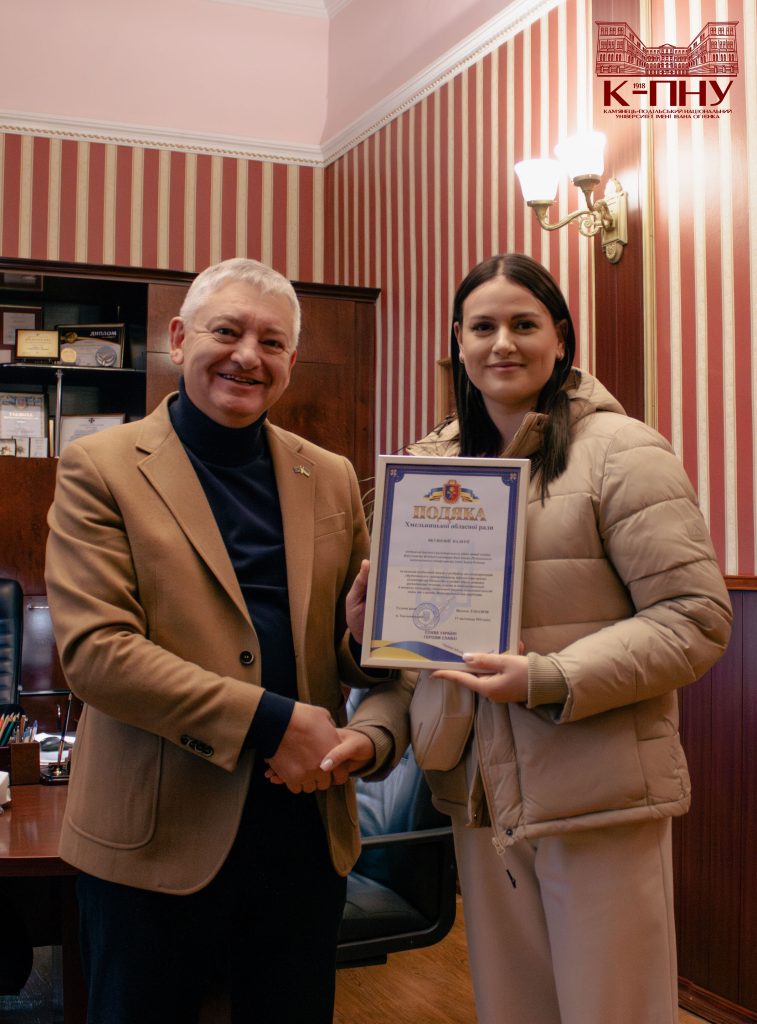 Валерії Якушевій вручив Почесну грамоту Хмельницької обласної ради та цінний подарунок за особистий внесок, розбудову та популяризацію студентського самоврядування, волонтерську діяльність в умовах війни, активну громадянську позицію та до Міжнародного дня студента.