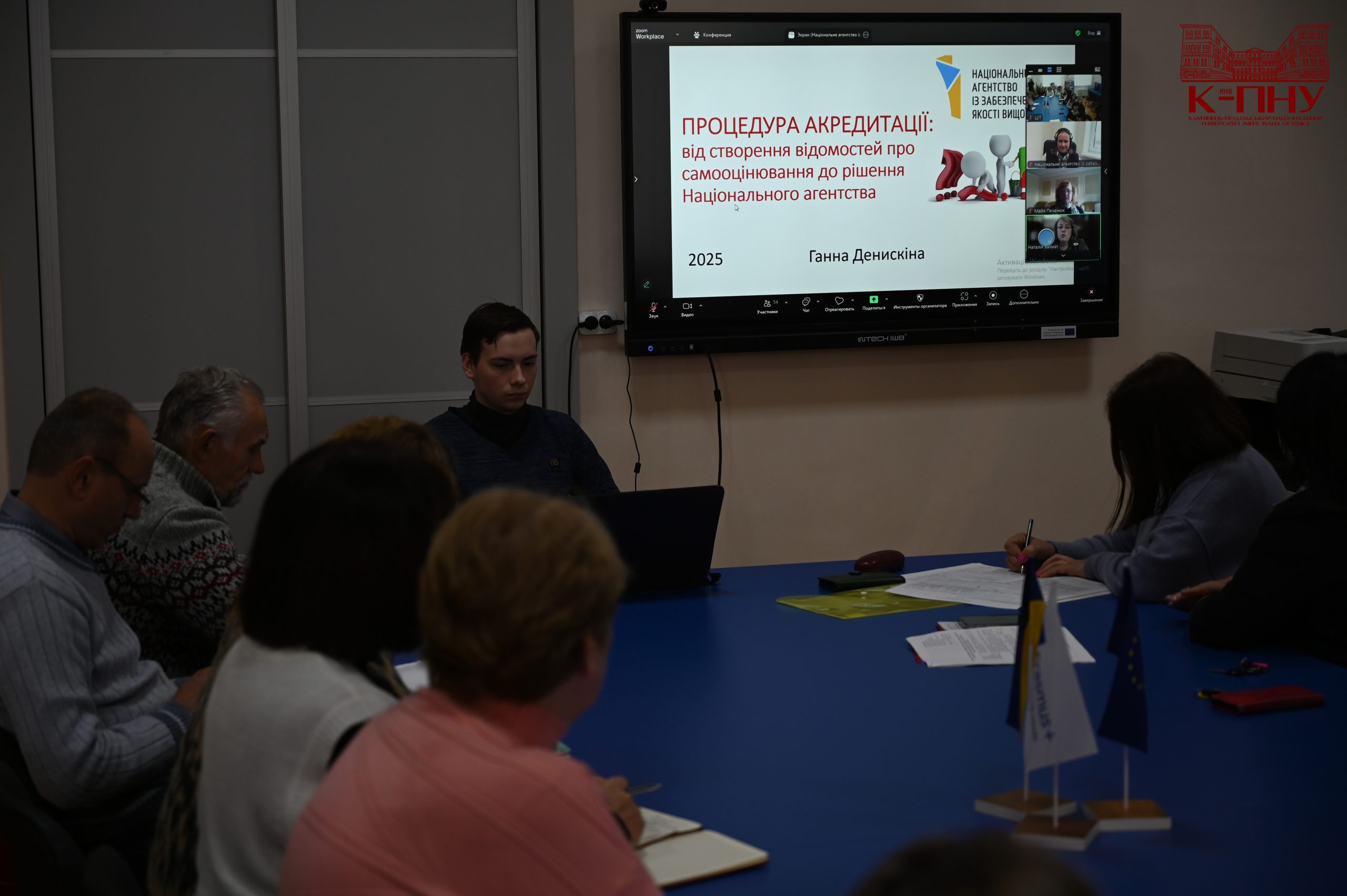 28 жовтня 2025 року проведено семінар «Процедура акредитації: від створення відомостей про самооцінювання до рішення Національного агентства» в межах програми підвищення кваліфікації для гарантів освітніх програм університету «Акредитація освітніх програм: механізми забезпечення якості вищої освіти в К-ПНУ». Модератором заходу є керівник навчально-методичного відділу Наталія Гудима.
