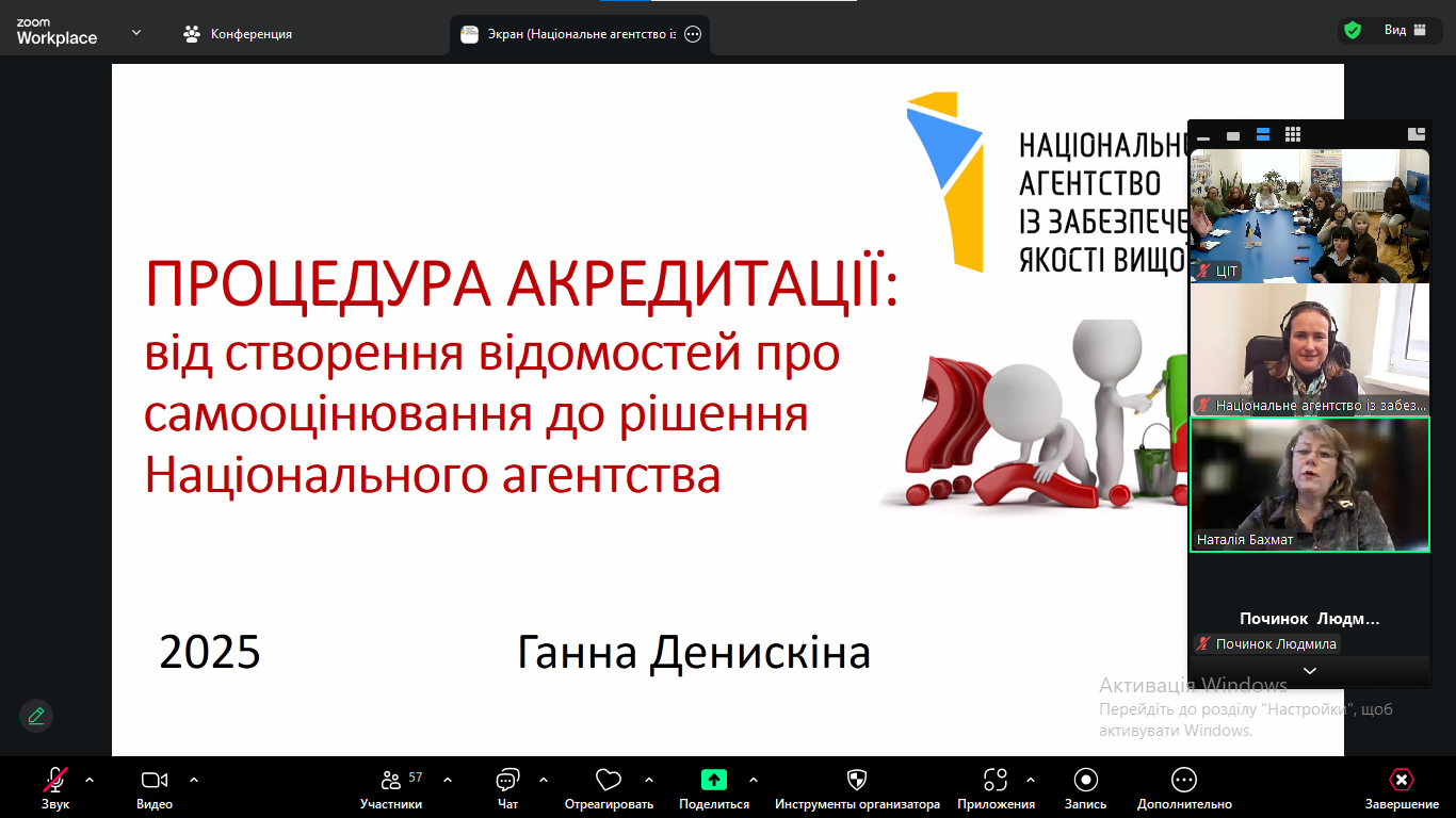 Ганна Денискіна детально та змістовно окреслила процедуру акредитації освітніх програм, зокрема виокремила зовнішні чинники впливу на якість вищої освіти, зосередила увагу учасників семінару на ключових фігурах та послідовності етапів роботи над відомостями про самооцінювання, презентувала інформаційну систему Національного агентства, наголосила на обовʼязкових і необовʼязкових елементах у структурі відомостей про самооцінювання тощо. Учасники семінару взяли активну участь в обговоренні важливих питань у контексті тематики семінару.