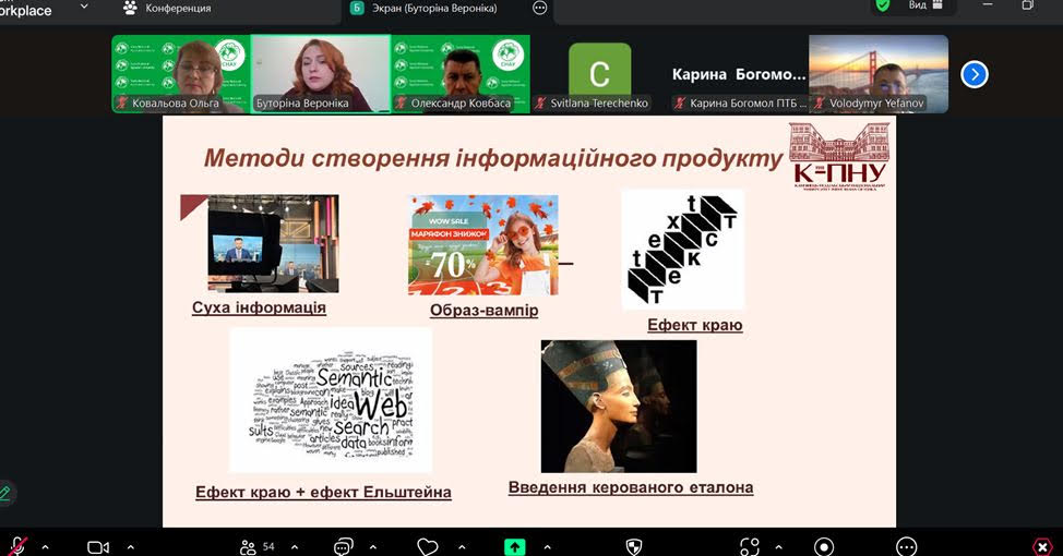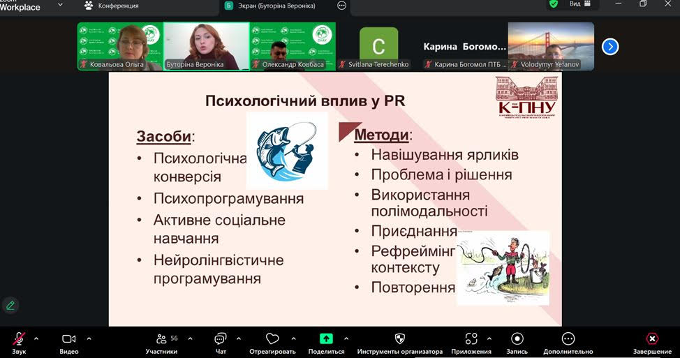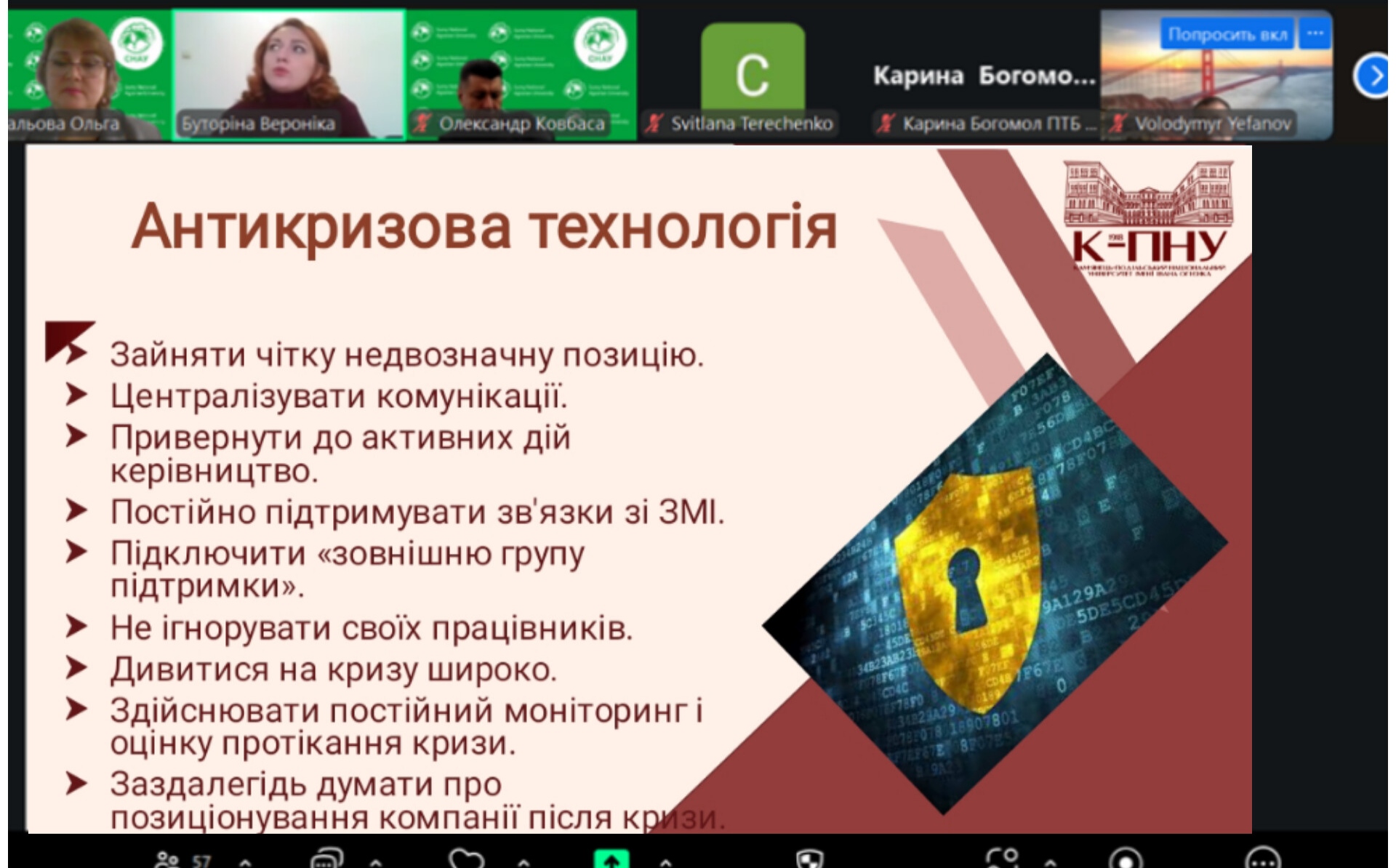 На онлайновому заході були присутні здобувачі вищої освіти спеціальностей кафедри та науково-педагогічні працівники. Слухачі ознайомились із сутністю і специфікою PR-технологій як частини маркетингової діяльності підприємства.