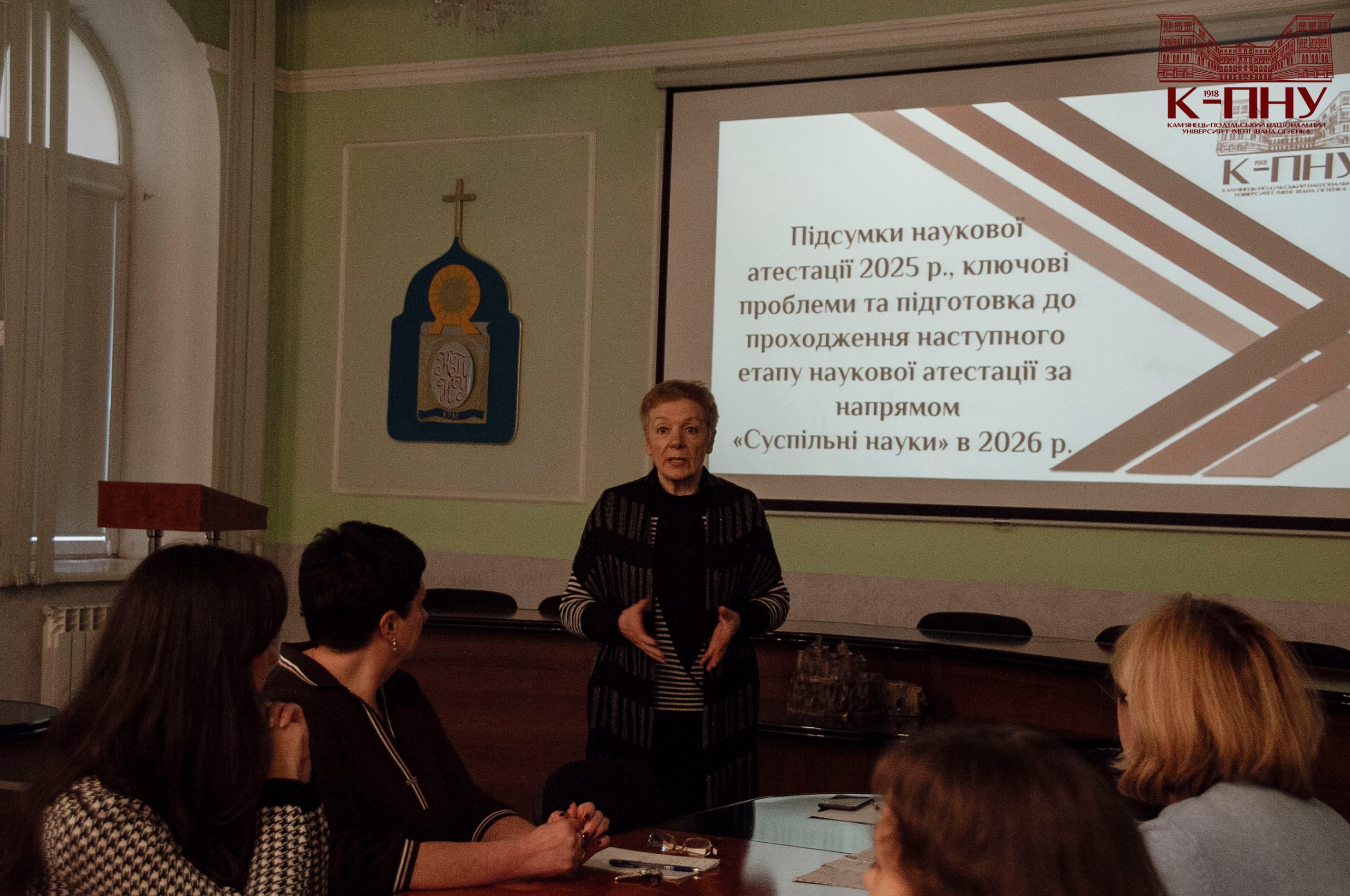 Завідувач навчально-дослідної служби Тетяна Франчук ознайомила з попередніми підсумками наукової атестації 2025 року та визначила ключові проблеми й пропозиції для підготовки до проходження наступного етапу наукової атестації за напрямом «Суспільні науки» у 2026 році.