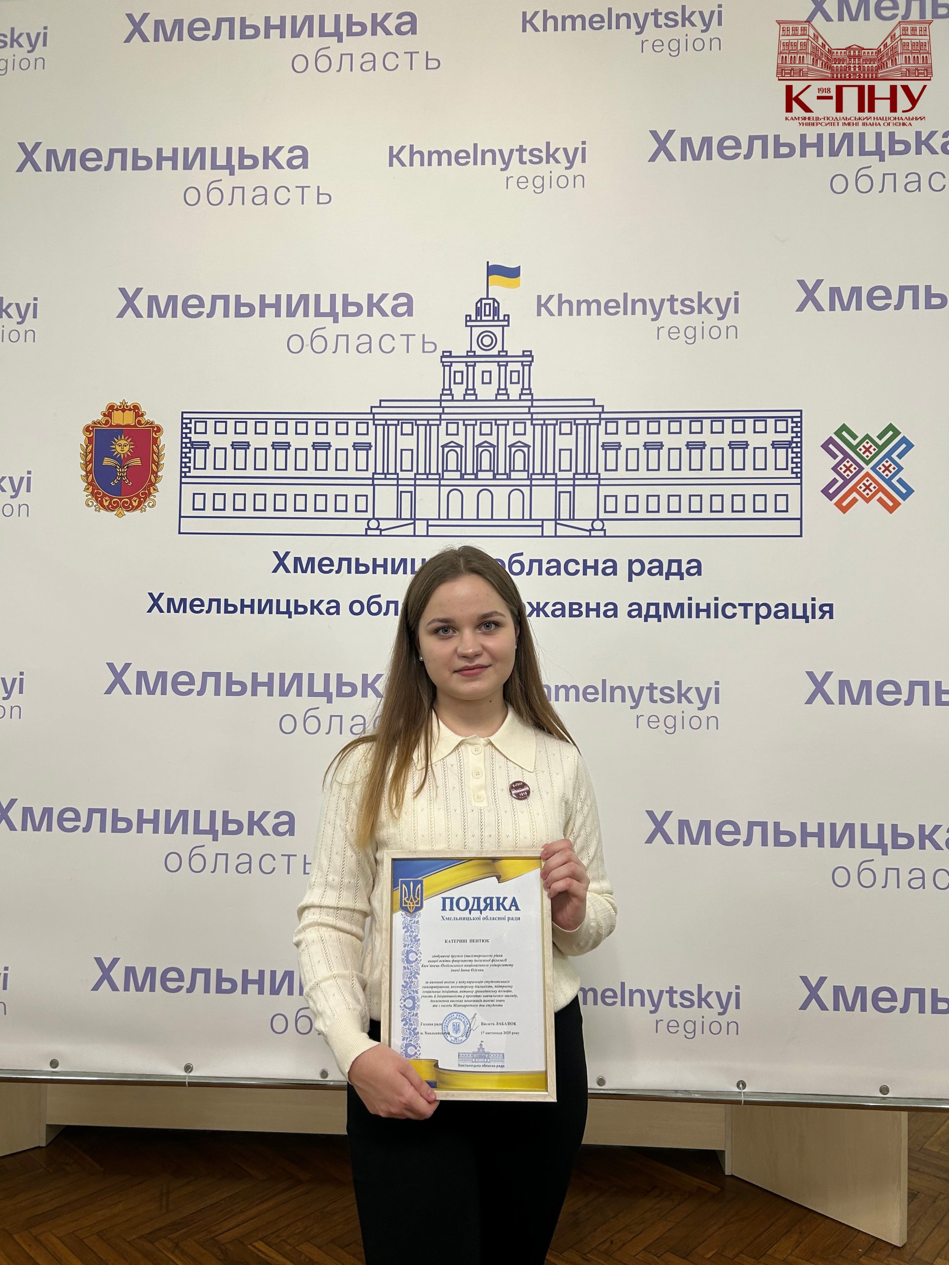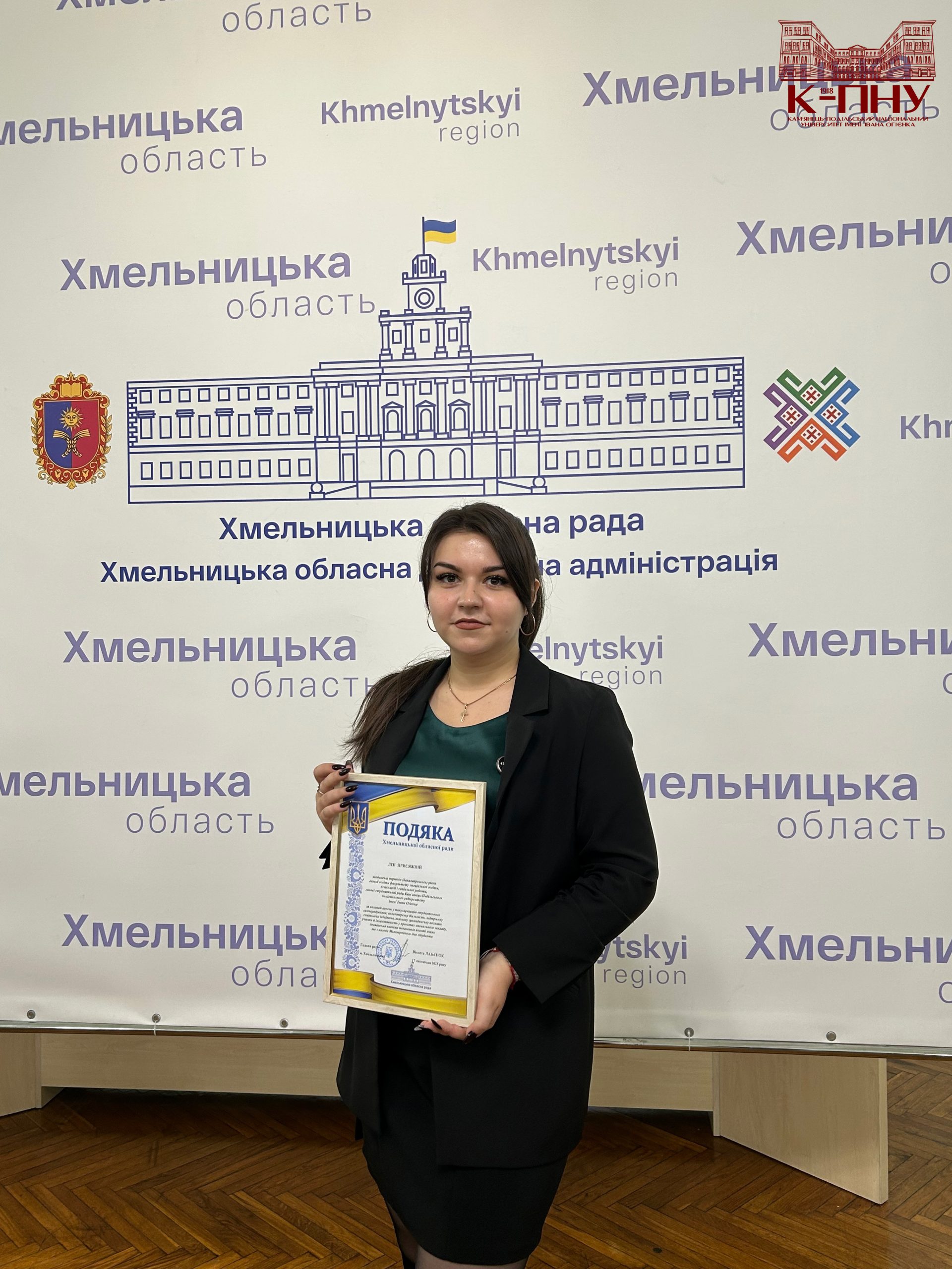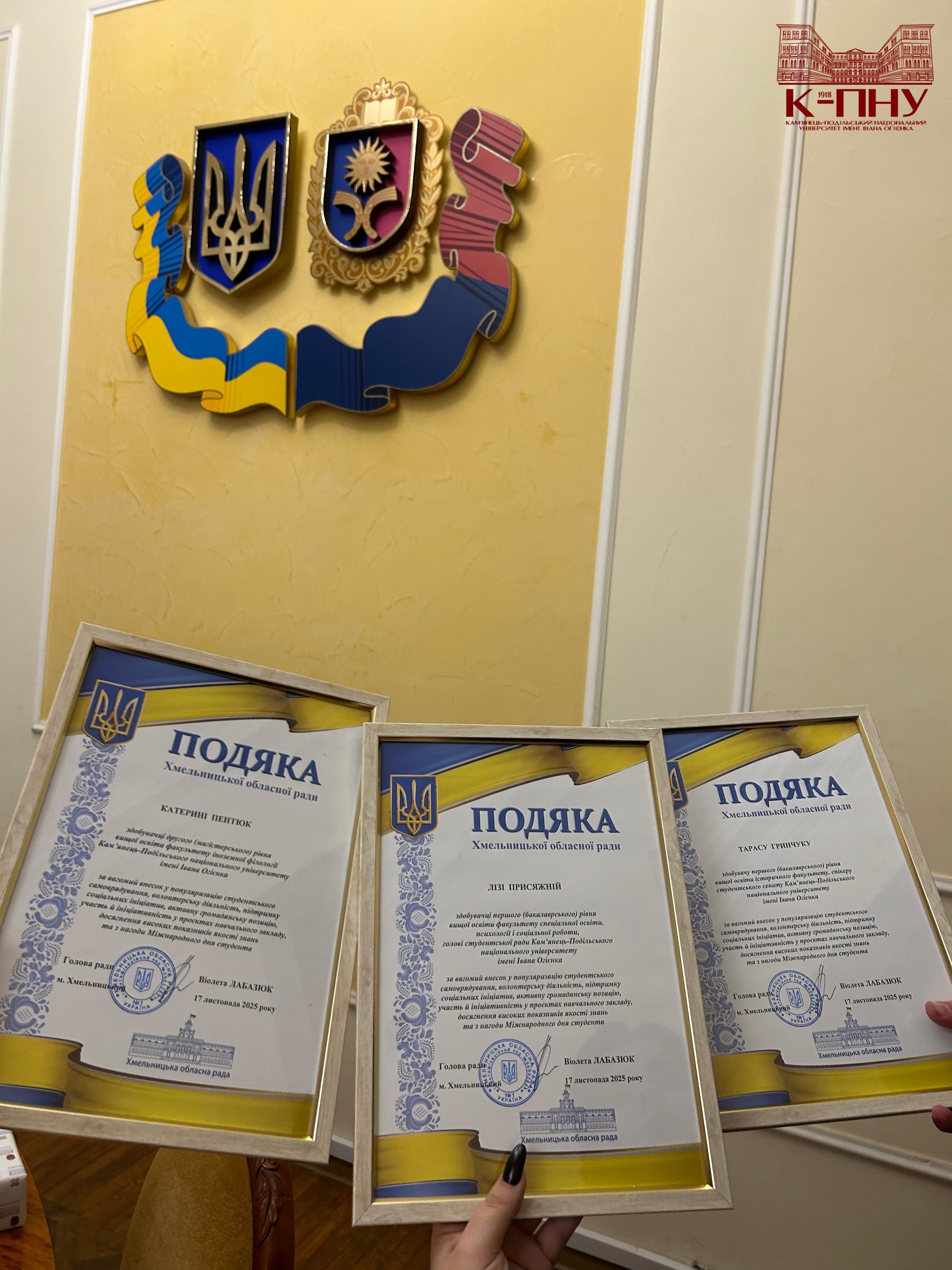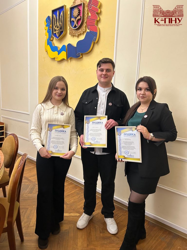 Кульмінацією зустрічі стало нагородження. За вагомий внесок у популяризацію студентського самоврядування, волонтерську діяльність, підтримку соціальних ініціатив, активну громадянську позицію та з нагоди Міжнародного дня студента всі представники делегації К-ПНУ отримали подяки Хмельницької обласної ради від Віолети Лабазюк.