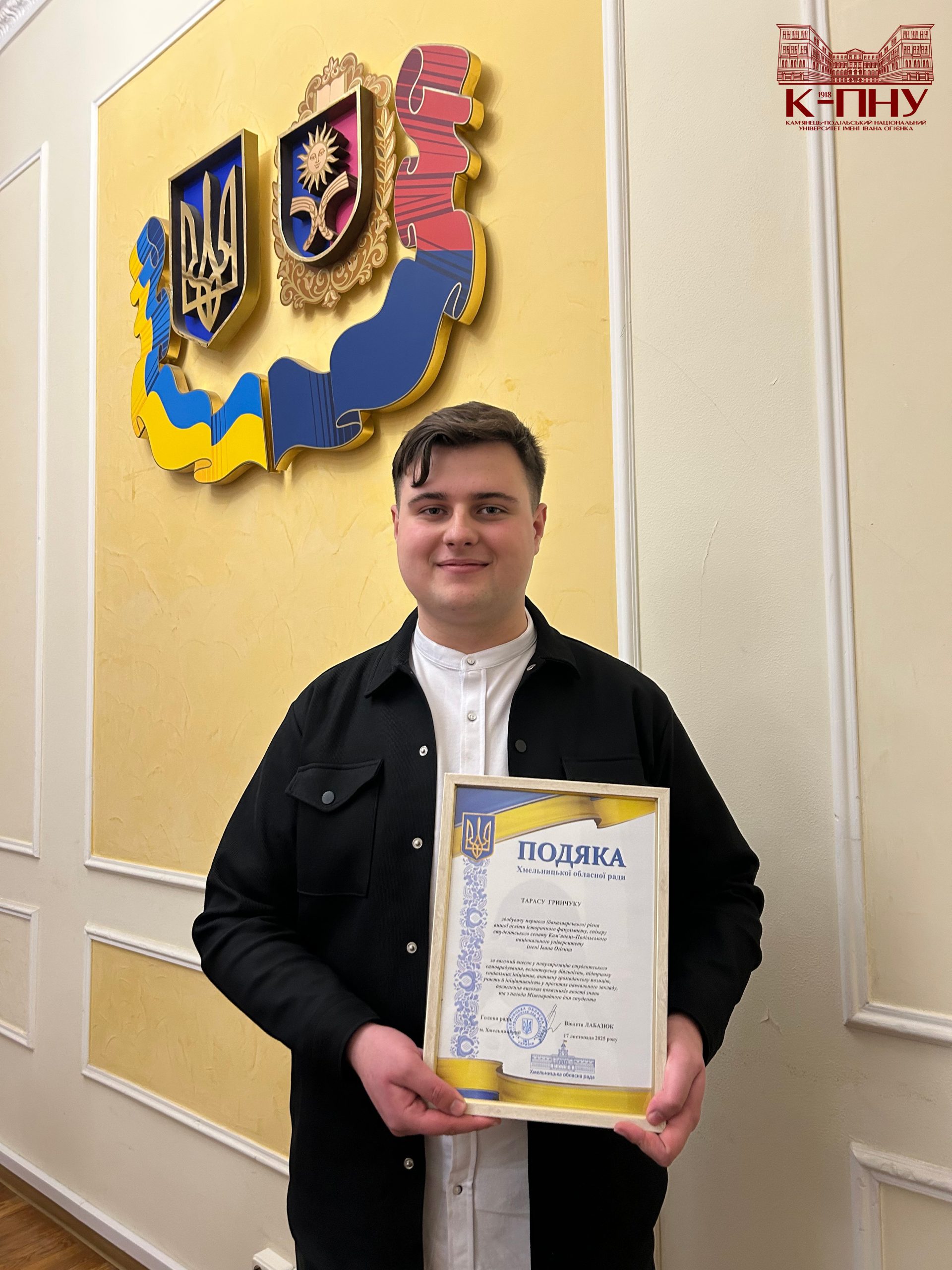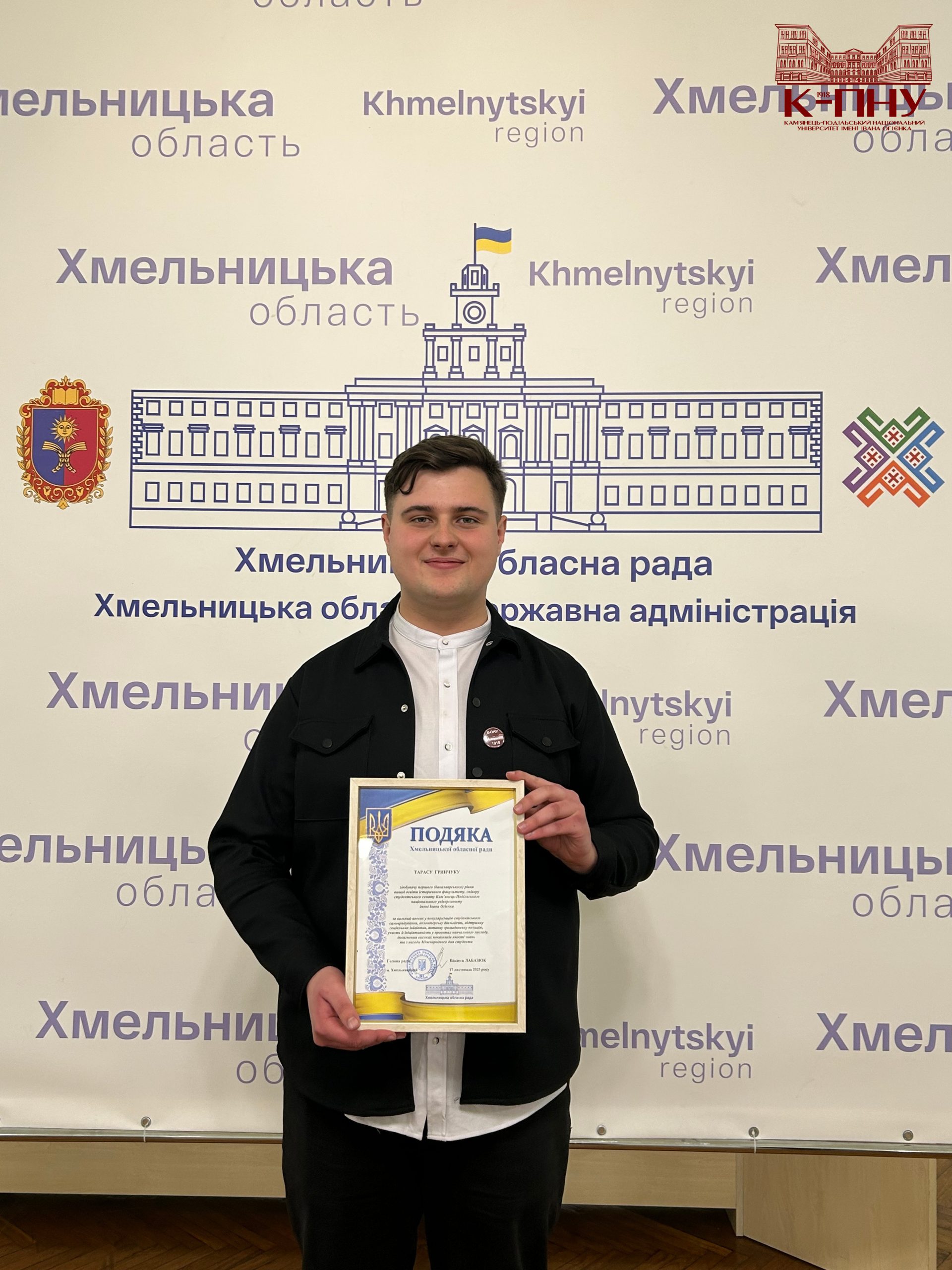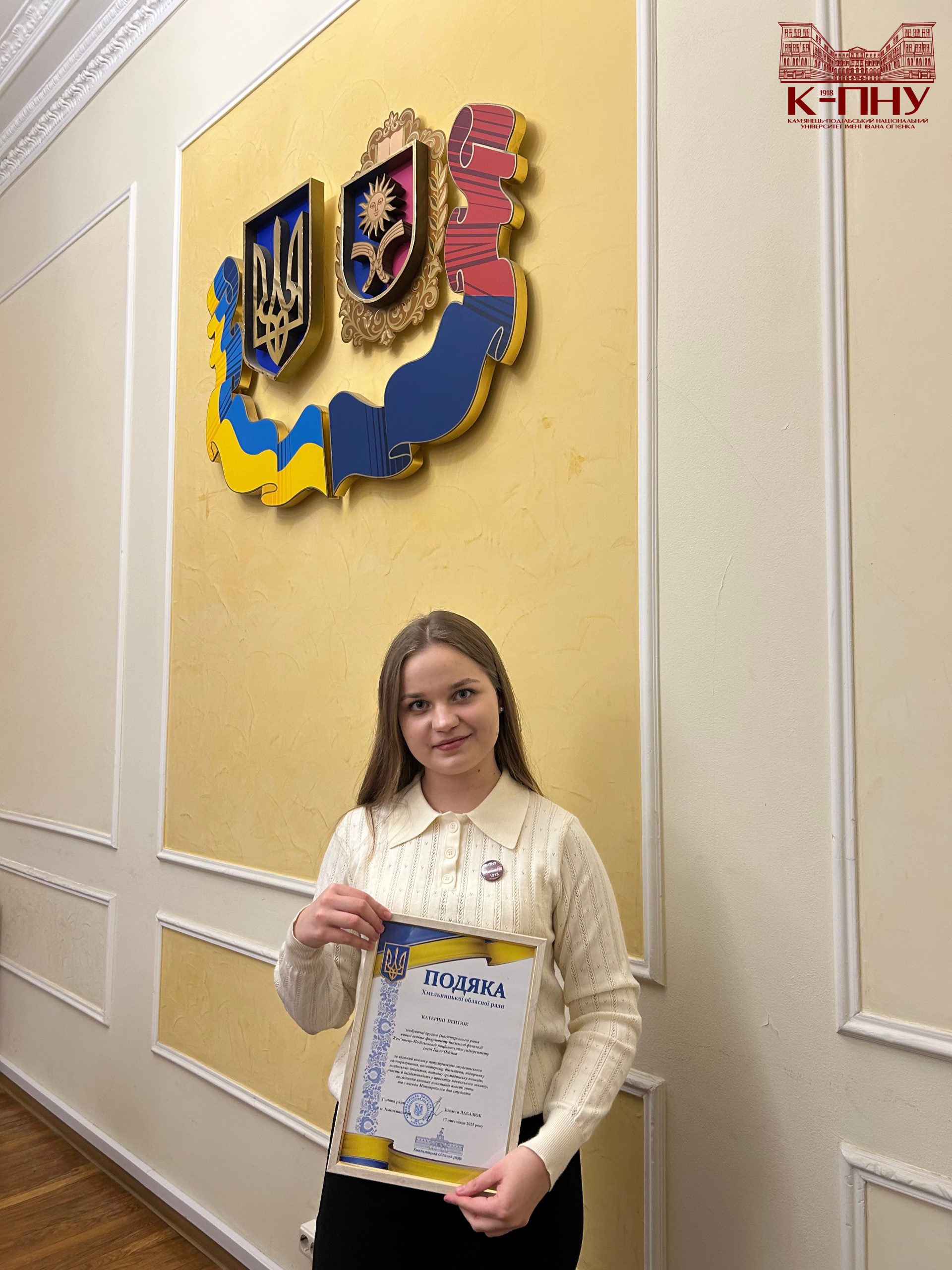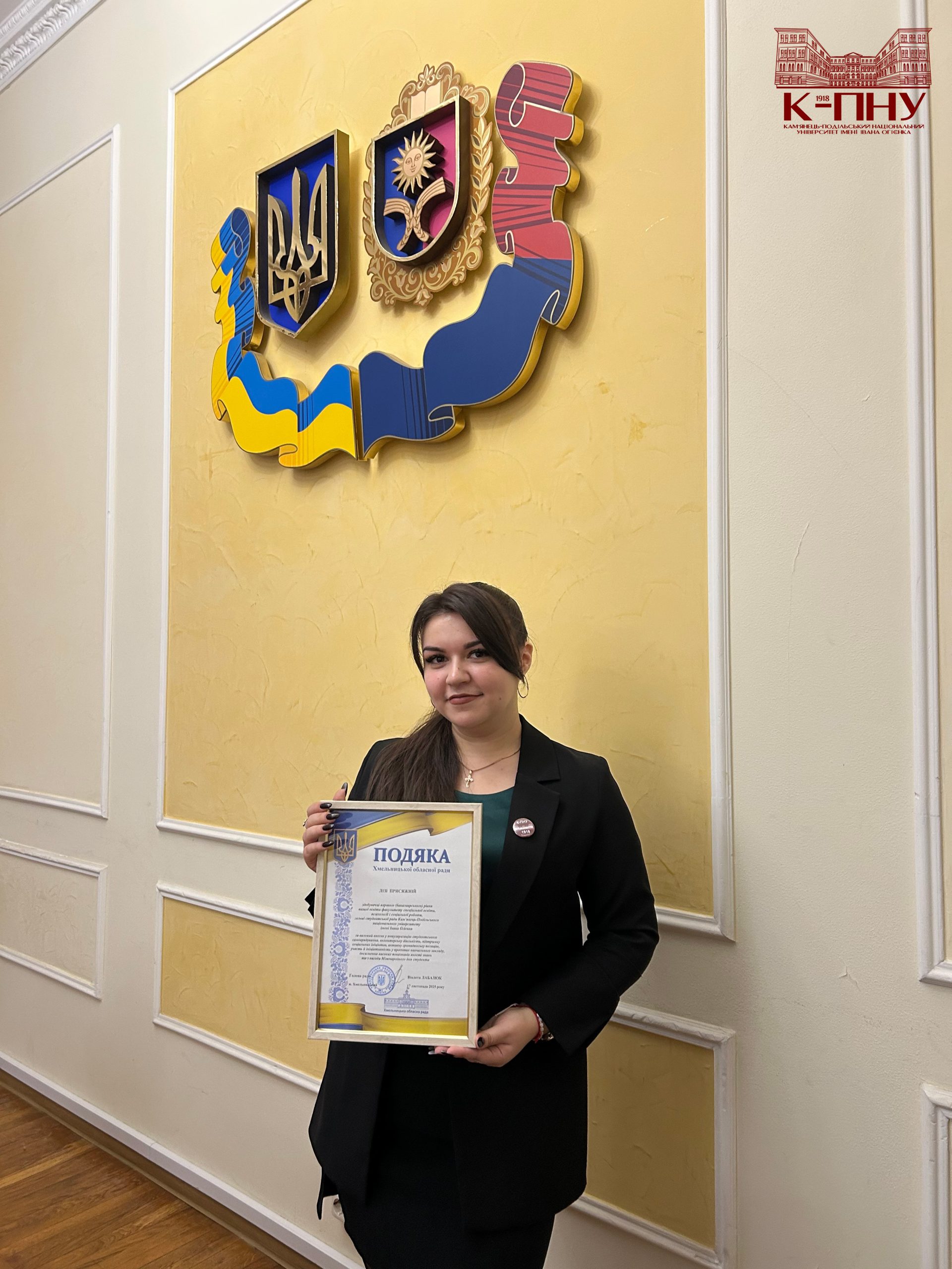 Кульмінацією зустрічі стало нагородження. За вагомий внесок у популяризацію студентського самоврядування, волонтерську діяльність, підтримку соціальних ініціатив, активну громадянську позицію та з нагоди Міжнародного дня студента всі представники делегації К-ПНУ отримали подяки Хмельницької обласної ради від Віолети Лабазюк.