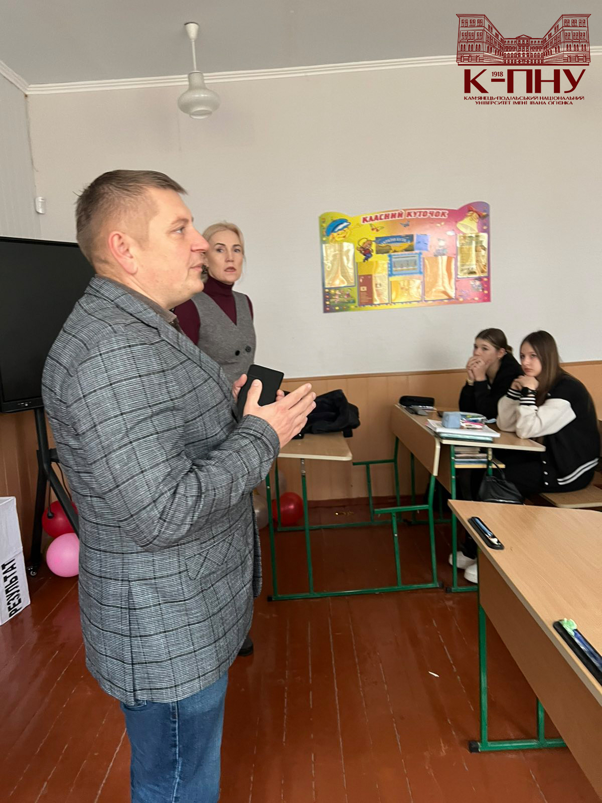 25 листопада завідувач кафедри географії та методики її викладання, кандидат географічних наук, доцент Ігор Касіяник та в.о. завідувача кафедри політології та філософії, кандидат соціологічних наук, доцент Тетяна Грубі зустрілися з одинадцятикласниками Кам’янець-Подільського ліцею №6 Кам’янець-Подільської міської ради Хмельницької області. Мета зустрічі полягала в тому, щоб ознайомити одинадцятикласників з особливостями освітнього процесу та розповісти про можливості, які відкриває навчання в одному з провідних вищих навчальних закладів України.