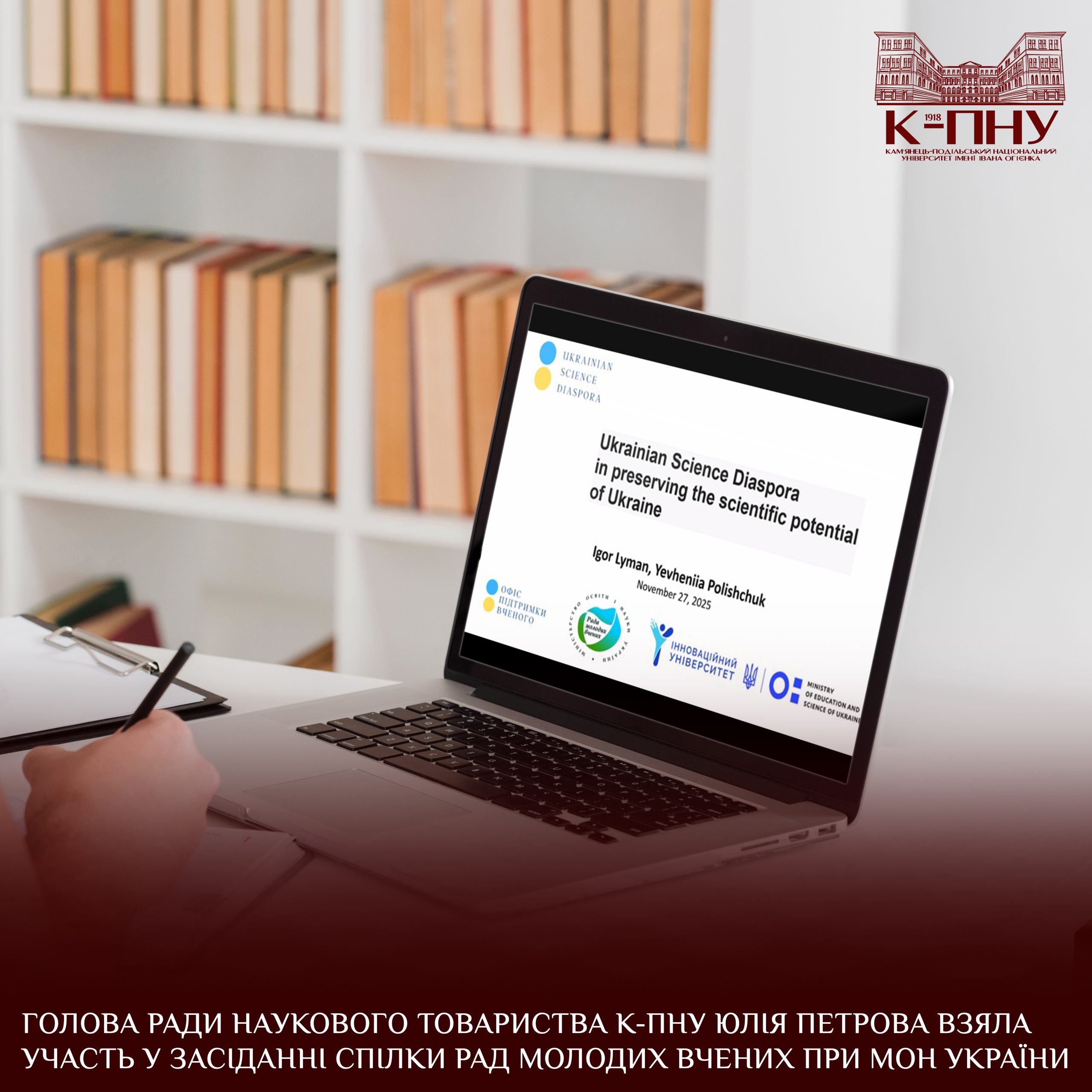 Юлія Петрова, голова ради Наукового товариства студентів (слухачів), аспірантів, докторантів і молодих вчених К-ПНУ, взяла участь у черговому засіданні Спілки Рад молодих вчених при Міністерстві освіти і науки України, яке відбулось у дистанційному форматі 27 листопада 2025 року.