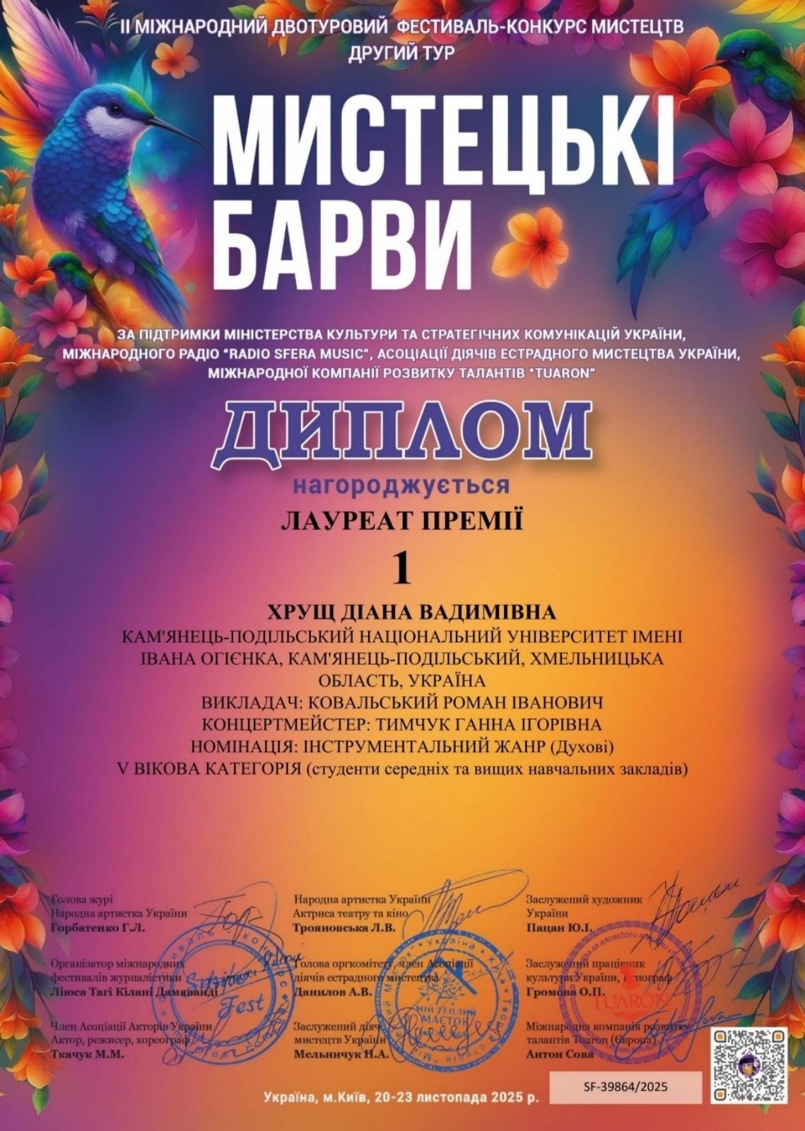 Здобувачка вищої освіти ІІІ курсу предметної спеціальності Середня освіта (Музичне мистецтво) Діана Хрущ стала лавреатом 1 ступеня в номінації інструментальний жанр (духові інструменти – саксофон) у V віковій категорії (клас викладача Романа Ковальського).