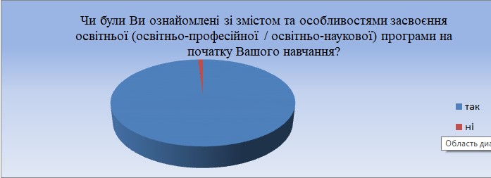 За результатами проведеного опитування встановлено, що 98,5 % здобувачів були ознайомлені зі змістом та особливостями засвоєння освітніх програм на початку навчання та 1,5 % здобувачів відповіли, що ознайомлені не були.
