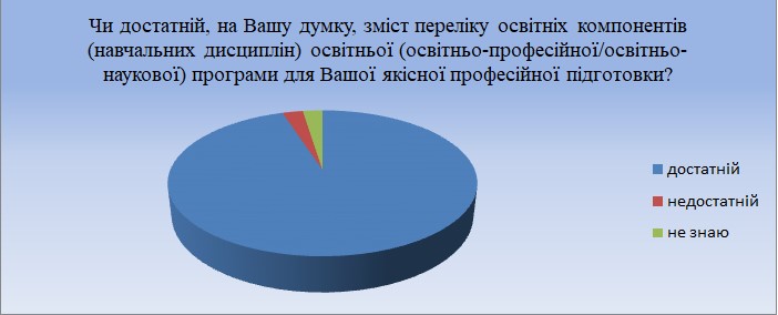 Достатній зміст переліку освітніх компонентів (навчальних дисциплін) освітніх програм для якісної професійної підготовки забезпечено, що підтверджують такі відсотки: «достатній» – зазначили 92,4 % опитаних, «недостатній» – 2,1 %, «не знаю» – 5,5 %.