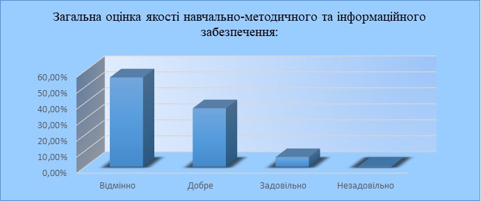 Загальну оцінку якості навчально-методичного та інформаційного забезпечення освітнього процесу здобувачами вищої освіти було оцінено на «відмінно» – 55,9 % здобувачів вищої освіти; «добре» – 36,6 %; «задовільно» – 6,1 %, «незадовільно» – 0,4 %.
