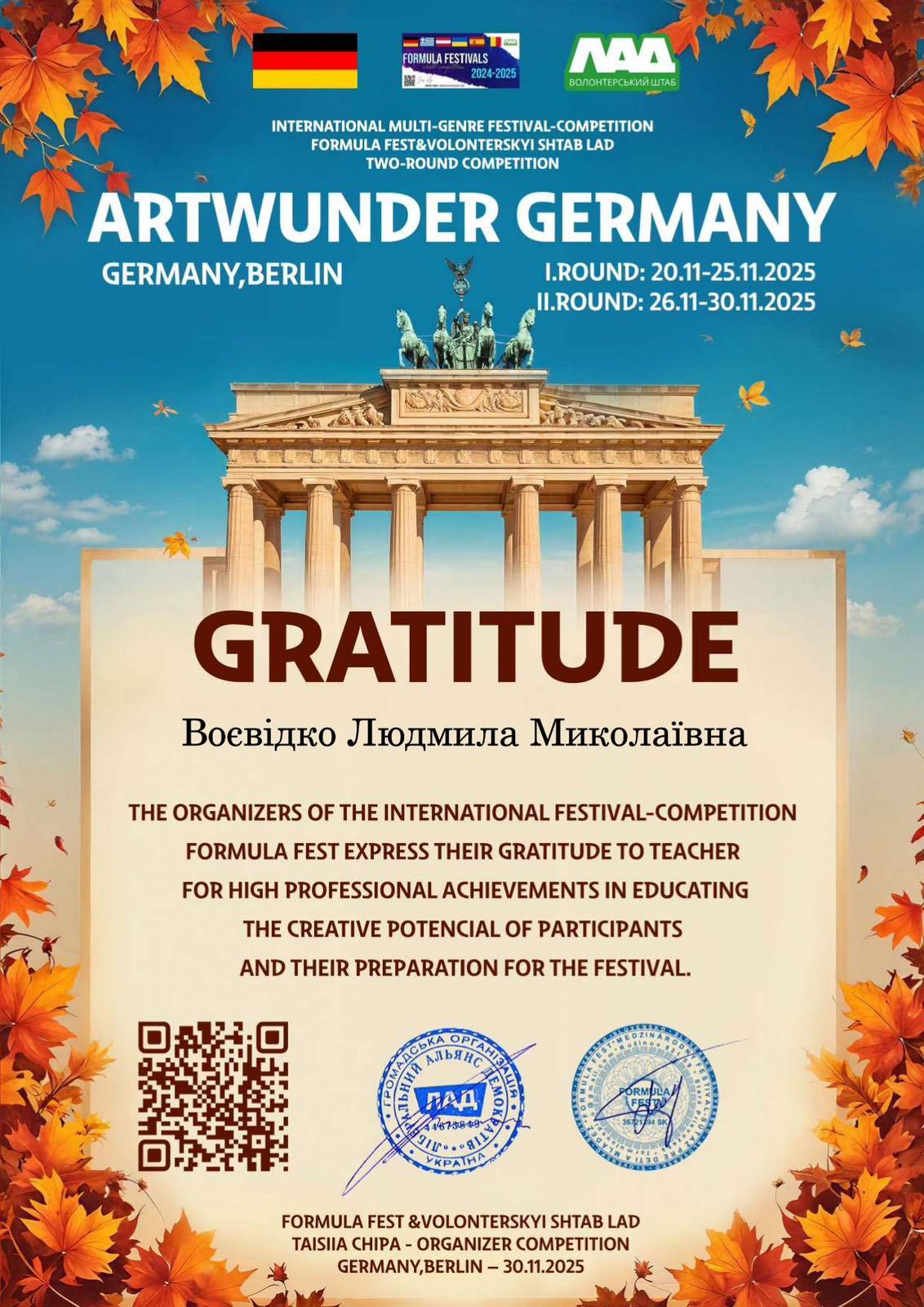 Здобувач вищої освіти освітньо-професійної програми «Середня освіта (Музичне мистецтво)» Олександр Стаднік із навчальної дисципліни «Хорове диригування» (клас доцента Людмили Воєвідко) виборов Першу премію в Міжнародному конкурсі «Artwunder Germany» в Берліні.