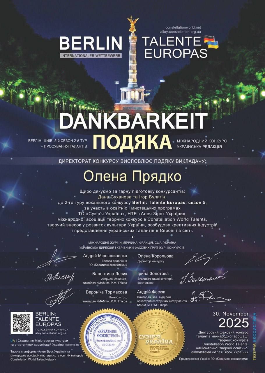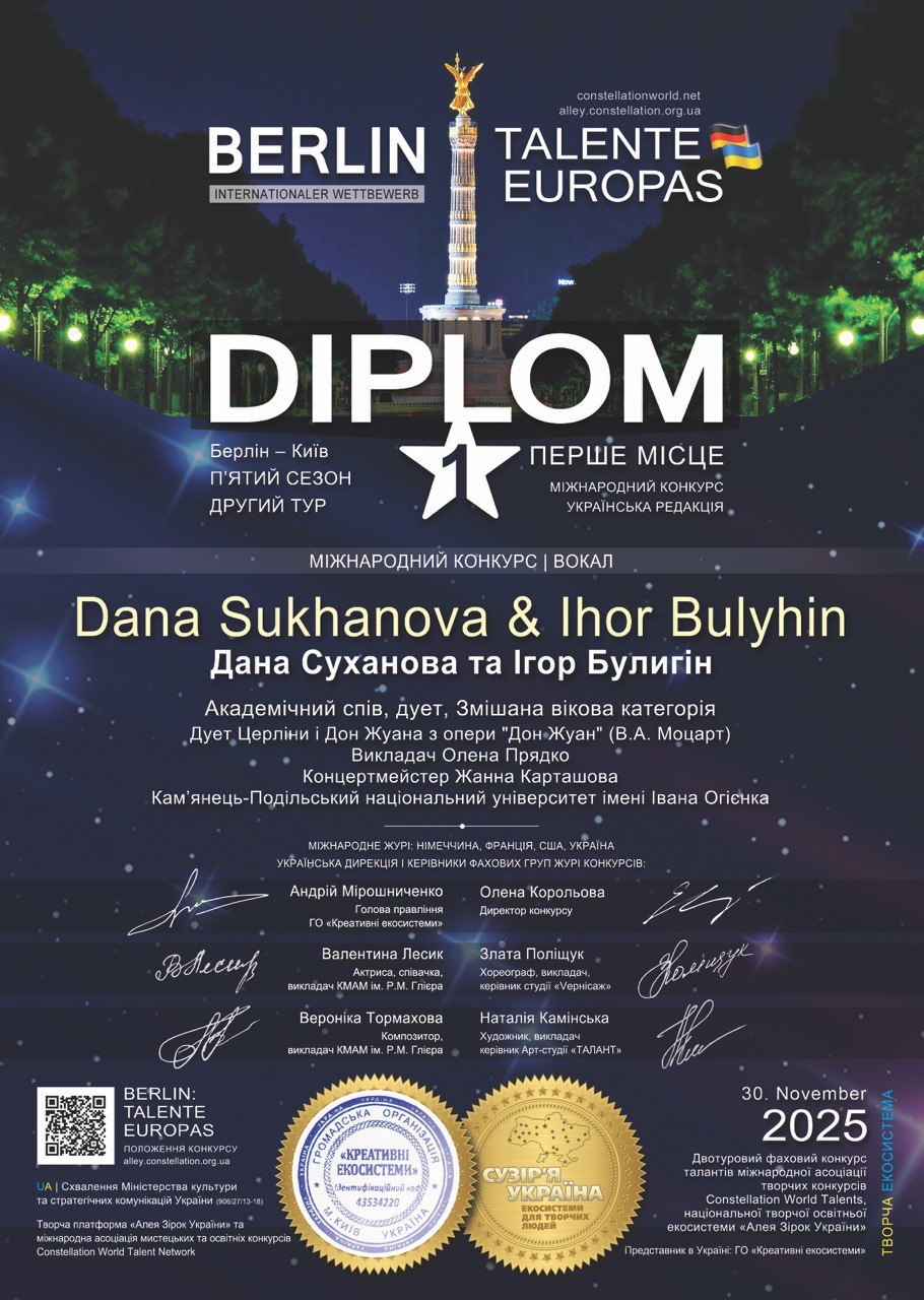 Дует у складі Дани Суханової та Ігоря Булигіна, магістрантів предметної спеціальності Середня освіта (Мистецтво. Музичне мистецтво) (викладач – доцент Олена Прядко, концертмейстер – доцент Жанна Карташова), отримав диплом І ступеня V сезону Міжнародного конкурсу «Berlin. Talante Europas», творчого змагання міжнародної асоціації мистецьких та освітніх конкурсів Constellation World Talents, національної творчої освітньої екосистеми Алея Зірок України та міжнародної освітньої компанії AdverMAN Education.