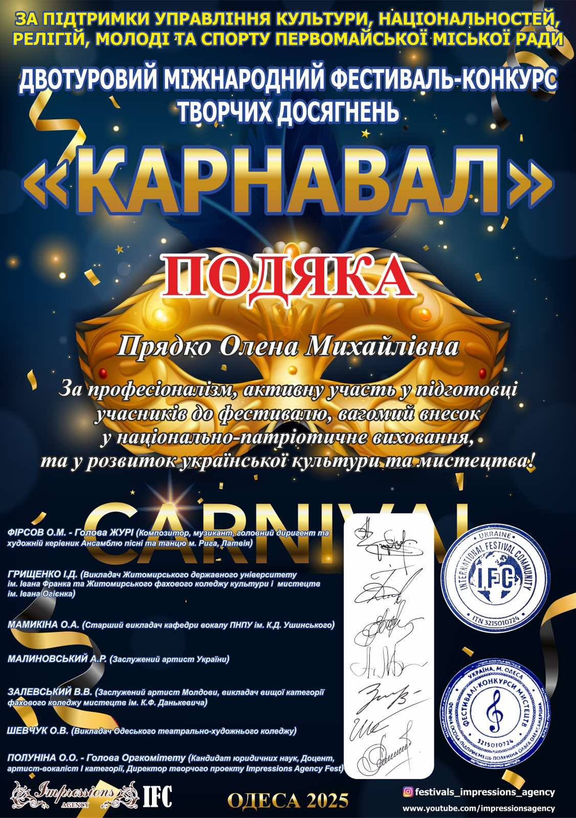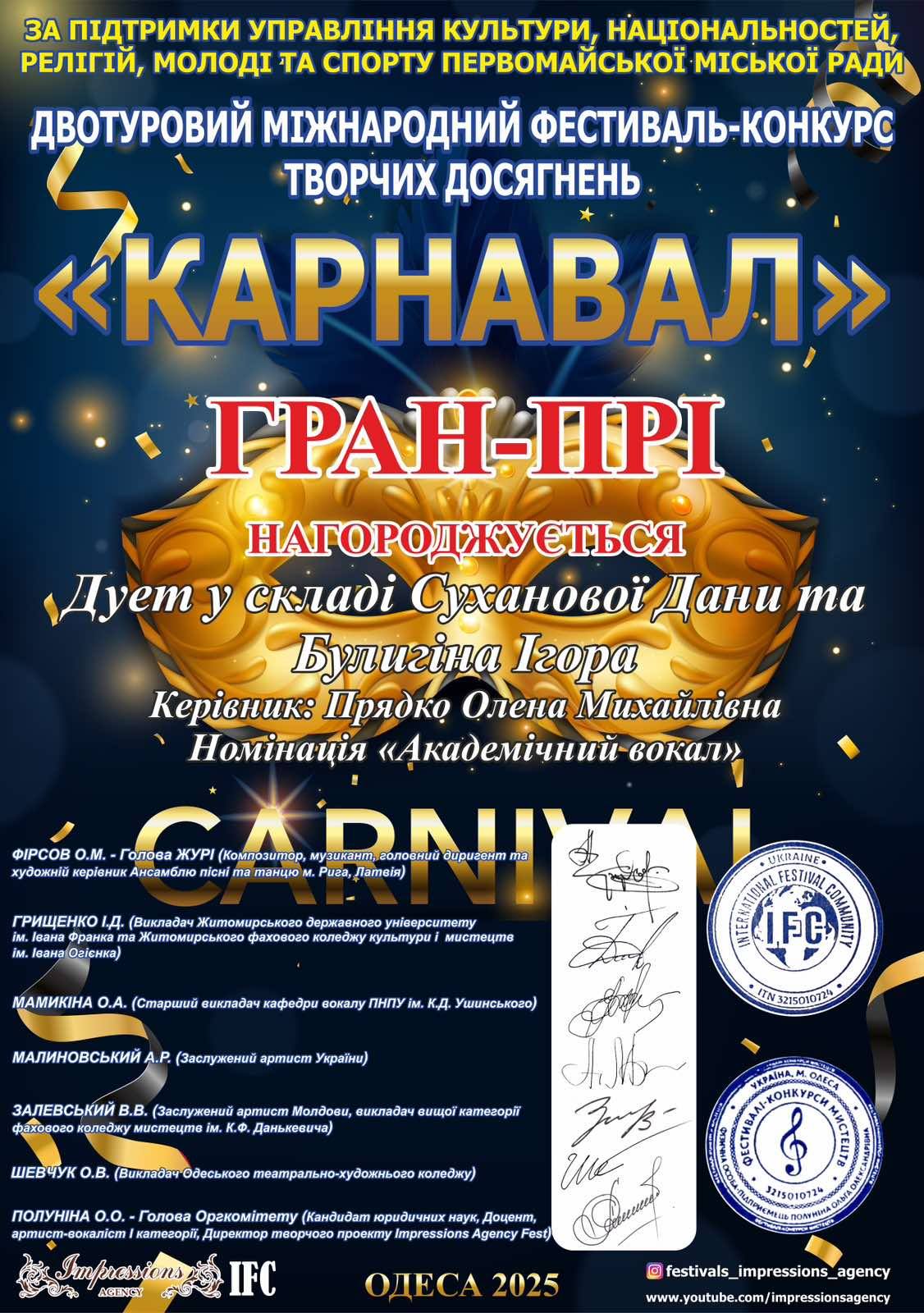 Щиро вітаємо магістрантів зі здобуттям гран-прі двотурового Міжнародного фестивалю-конкурсу творчих досягнень «Карнавал», який відбувався в м. Одеса 13-14 грудня 2025 року.