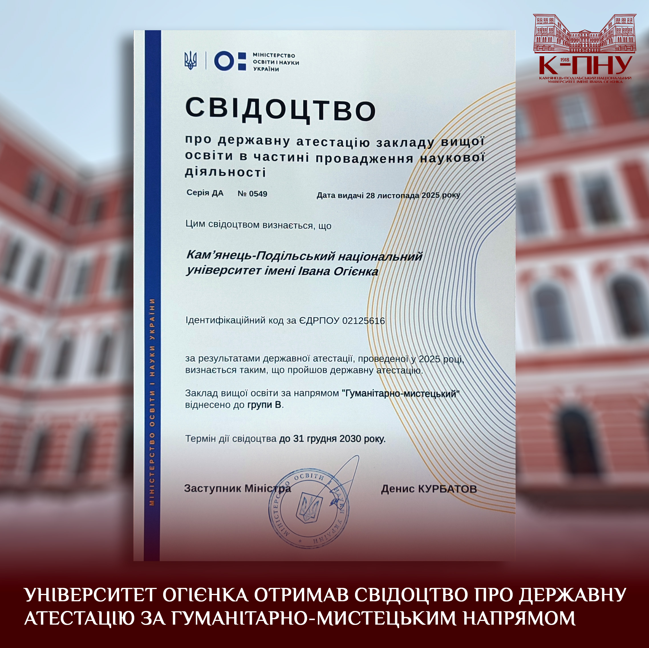 Вітаємо колектив Кам’янець-Подільського національного університету імені Івана Огієнка з одержанням Свідоцтва про державну атестацію закладу вищої освіти в частині провадження наукової діяльності за гуманітарно-мистецьким напрямом.