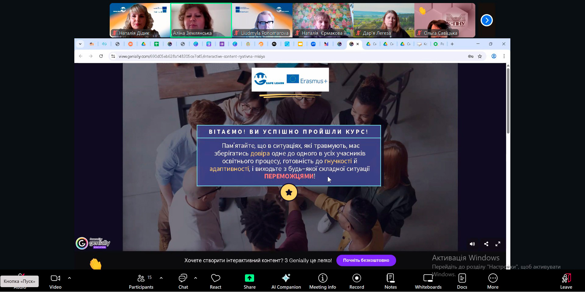 11 лютого кандидат психологічних наук, доцент, доцент кафедри загальної та практичної психології Наталія Дідик провела четвертий тренінг «Pedagogical Escape Room: Solving crisis tasks» («Педагогічна квест-кімната: вирішення кризових завдань»), який відбувся в межах проєкту Програми ЄС Еразмус+ Supporting Adaptive and Flexible for War-Affected Ukraine Students (Підтримка адаптивної та гнучкої освіти для студентів в Україні, які постраждали від війни) 101236049-SAFE LEARN ERASMUS-EDU-2025-CBHE.