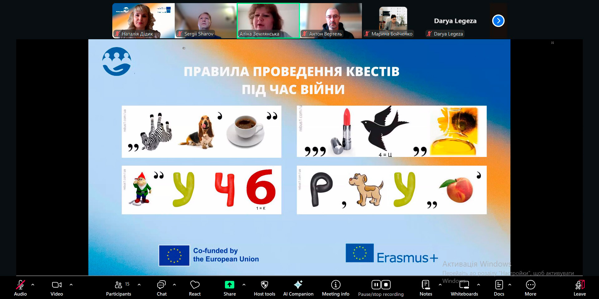 На тренінговому занятті учасники розв’язували ігрові ситуації для вирішення кризових педагогічних викликів, формували вміння застосовувати квест-технологію як ефективний інструмент навчання й професійного розвитку, здатність проєктувати педагогічні квести для моделювання кризових ситуацій, відпрацьовували навички прийняття рішень, командної співпраці й психологічної стійкості в умовах невизначеності.