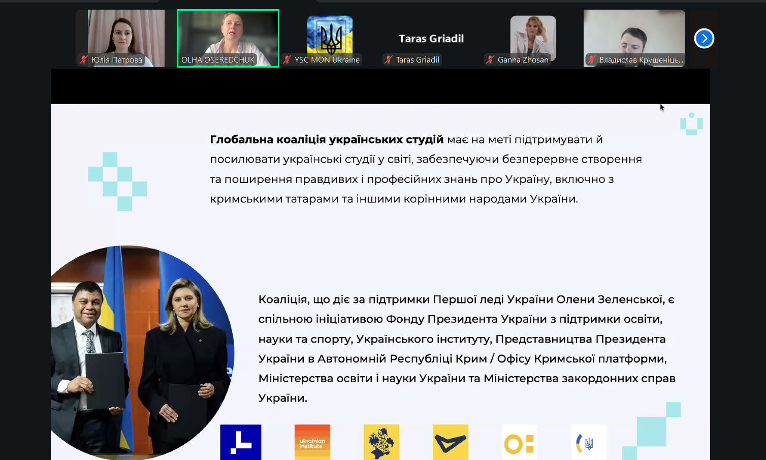 Під час зустрічі було представлено доповідь із теми «Глобальна коаліція українських студій та молоді вчені» (спікер – Ольга Осередчук, доктор педагогічних наук, керівник Проєктного офісу Глобальної коаліції українських студій, професор кафедри практичної психології та ментального здоров’я Національного університету «Львівська Політехніка»).