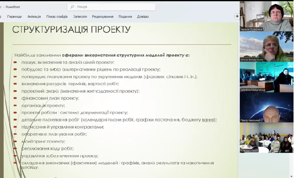 - цифрова компетентність: навички використання програм для управління проєктами (зокрема MS Project), опрацювання даних і підготовки звітів. До того ж, такий формат комунікацій за участю науковця-практика підсилив аналітичні навики учасників семінару-тренінгу й зорієнтував їх у грантових програмах і міжнародних джерелах фінансування.