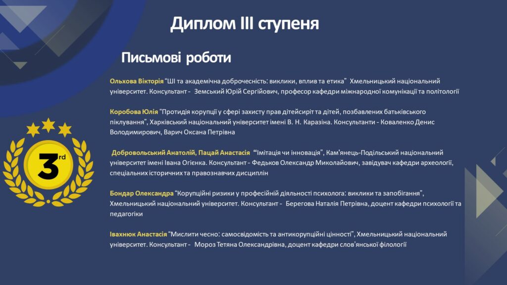 Здобувач третього (освітньо-наукового) рівня вищої освіти історичного факультету Кам’янець-Подільського національного університету імені Івана Огієнка Анатолій Добровольський узяв участь у Всеукраїнському конкурсі наукових робіт «Разом за доброчесність та антикорупцію. Твоє бачення має значення!», організованому Хмельницьким національним університетом.