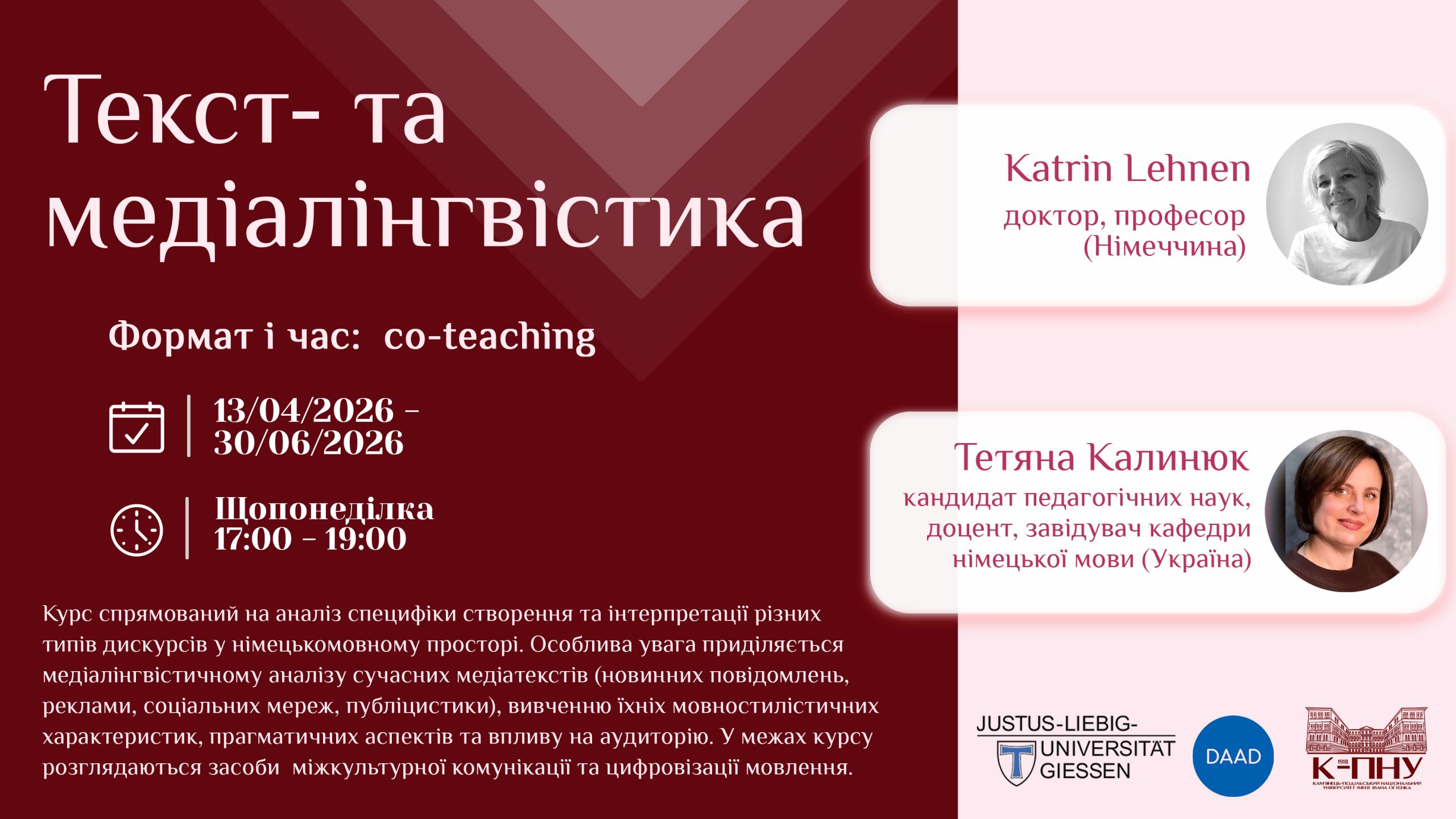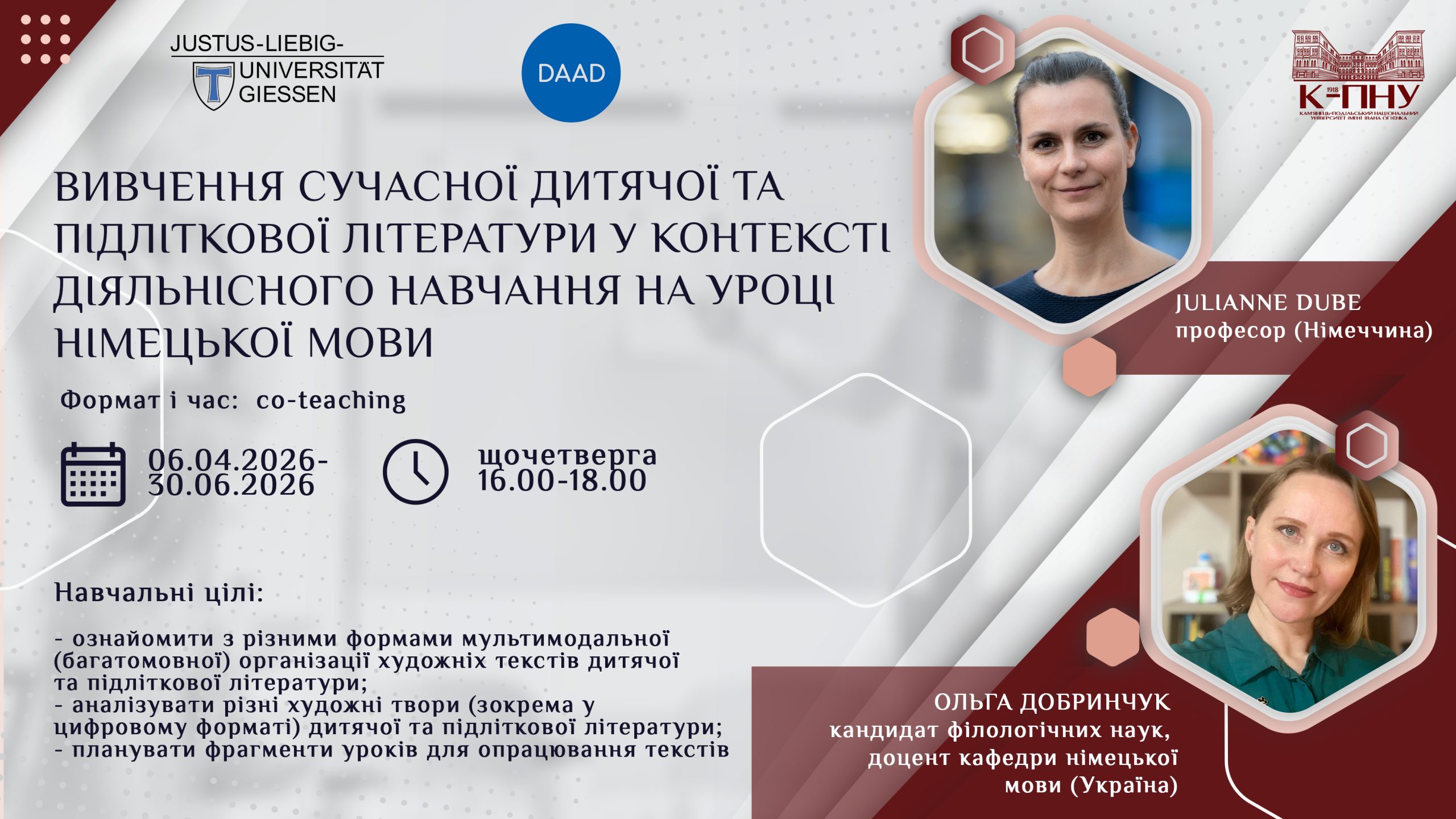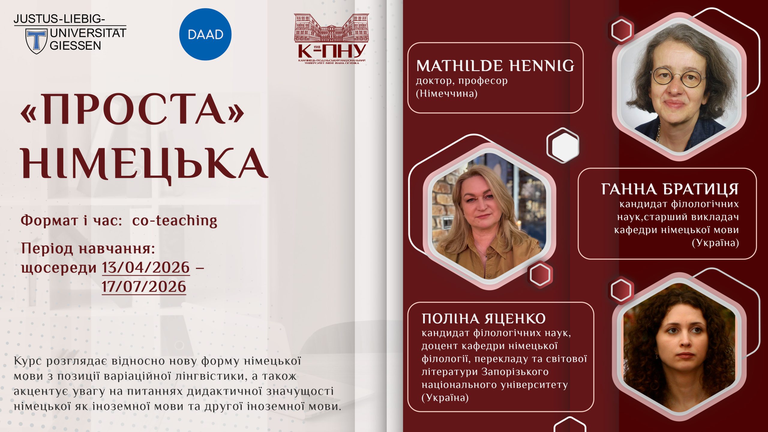 У межах програми науково-педагогічні працівники кафедри німецької мови: Тетяна Калинюк, Ганна Братиця, Ольга Добринчук – проводитимуть навчальні семінари спільного викладання разом із колегами Гіссенського Університету Юстуса Лібіха (JLU, Gießen) – Mathilde Hennig, Katrin Lehnen, Julianna Dube.
