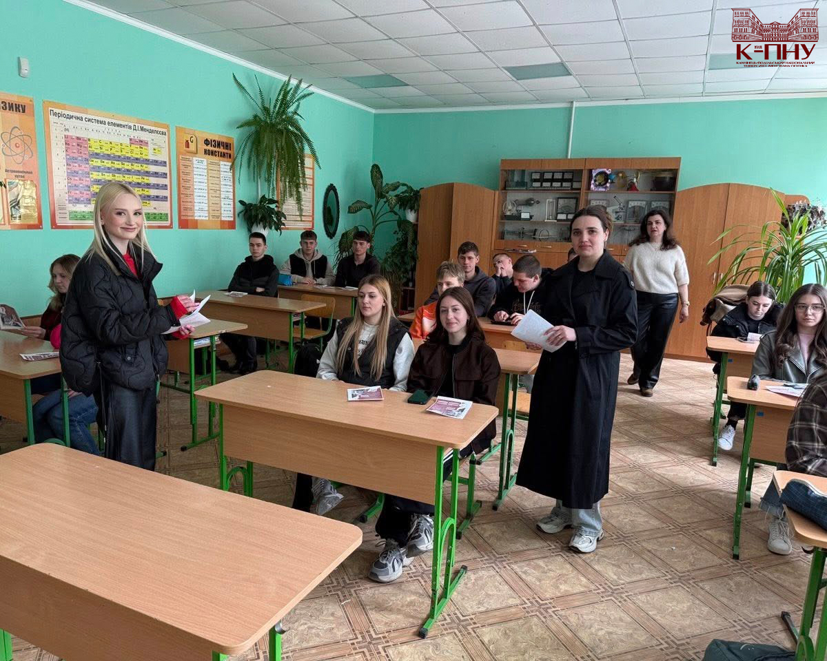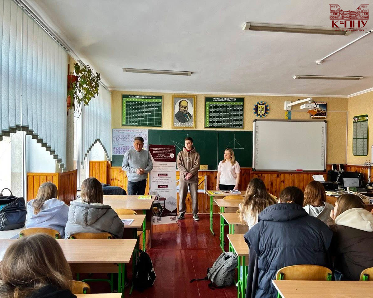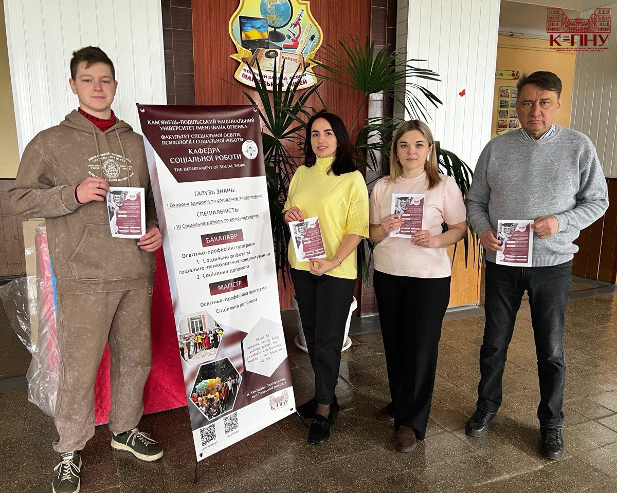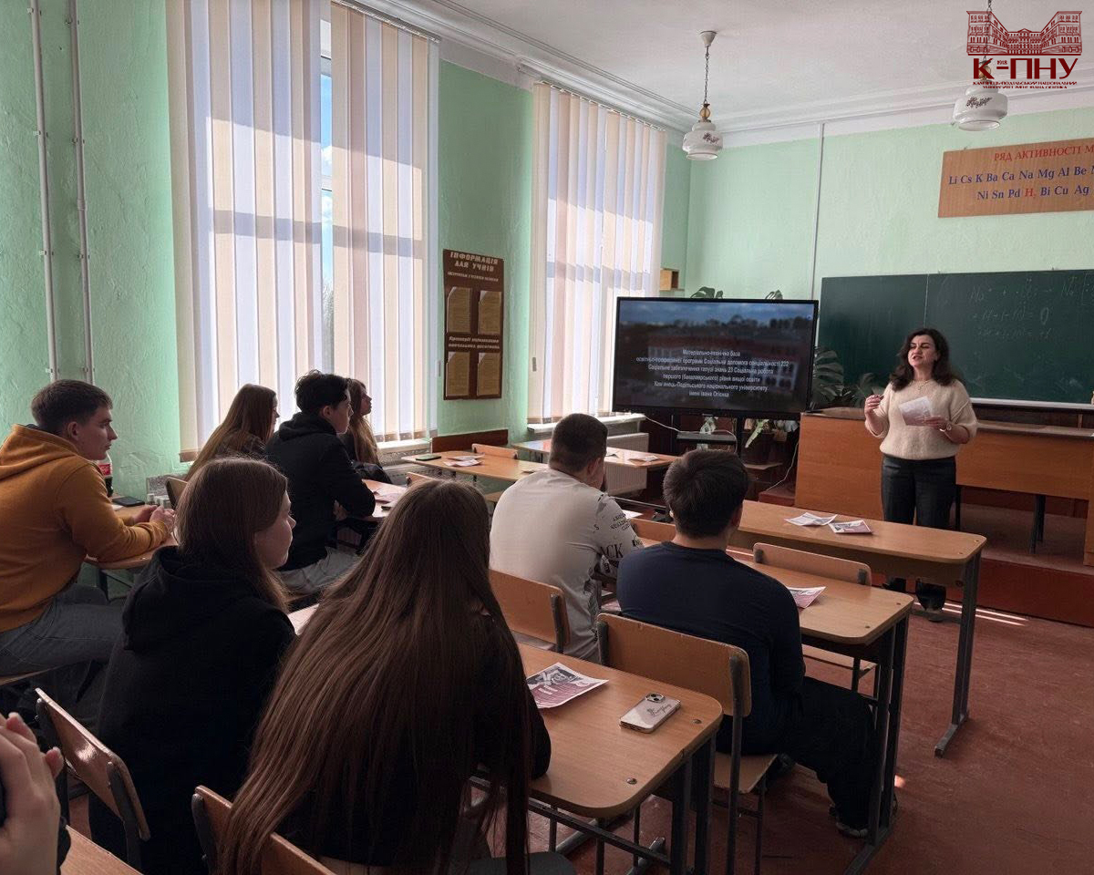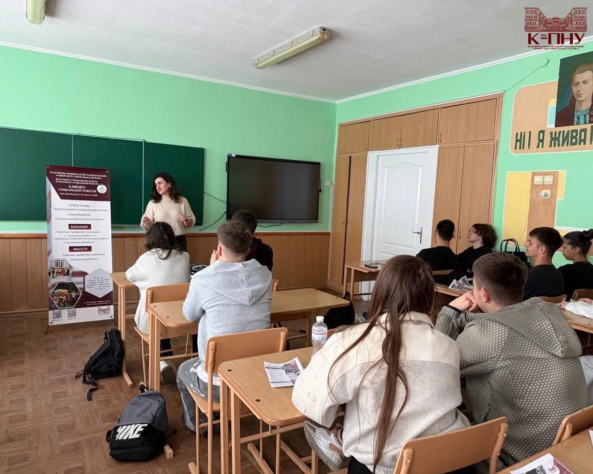 22 квітня 2026 року в ліцеях міста Дунаївці відбулися профорієнтаційні заходи. Декан факультету спеціальної освіти, психології і соціальної роботи К-ПНУ Тетяна Опалюк ознайомила майбутніх абітурієнтів зі спеціальностями, які можна здобути, навчаючись на факультеті. Спеціальність I10 Соціальна робота та консультування презентували завідувач кафедри соціальної роботи Наталія Гевчук, доцент Олена Данилюк і студенти кафедри.