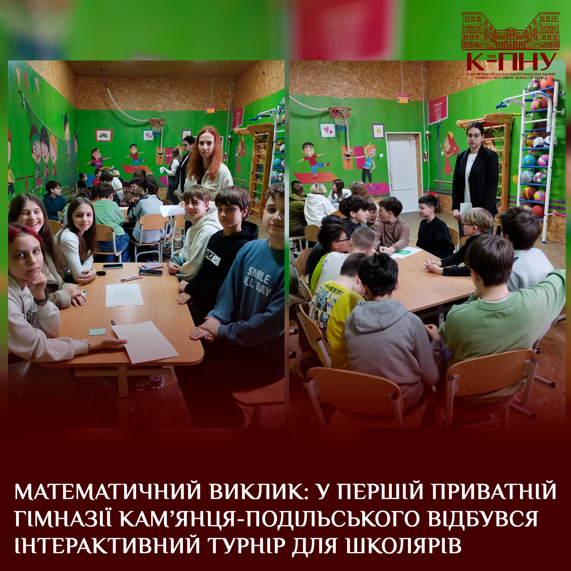 1 квітня 2026 року в стінах Першої приватної гімназії Кам’янця-Подільського з метою підвищення інтересу учнів до вивчення математики, розвитку логічного мислення й формування ключових компетентностей старший викладач кафедри математики К-ПНУ й, водночас, учитель-практик цього ЗЗСО Тетяна Думанська організувала й провела позакласний захід для учнів 5–7 класів. Захід відбувся у формі інтерактивного математичного турніру, який об’єднав учнів у команди й створив атмосферу дружнього змагання.