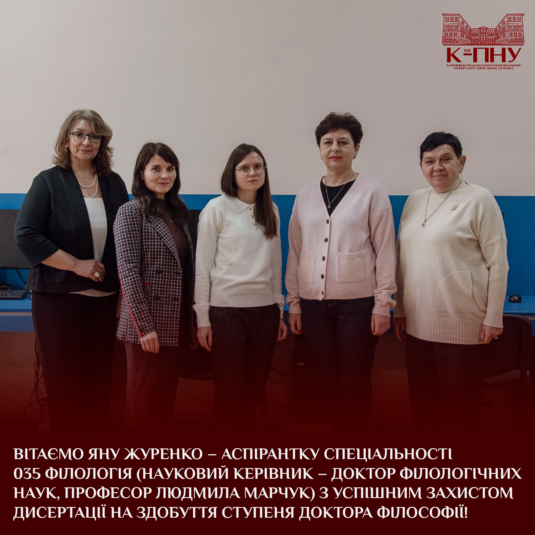 Вітаємо Яну Журенко – аспірантку спеціальності 035 Філологія (науковий керівник – доктор філологічних наук, професор Людмила Марчук) з успішним захистом дисертації на здобуття ступеня доктора філософії!