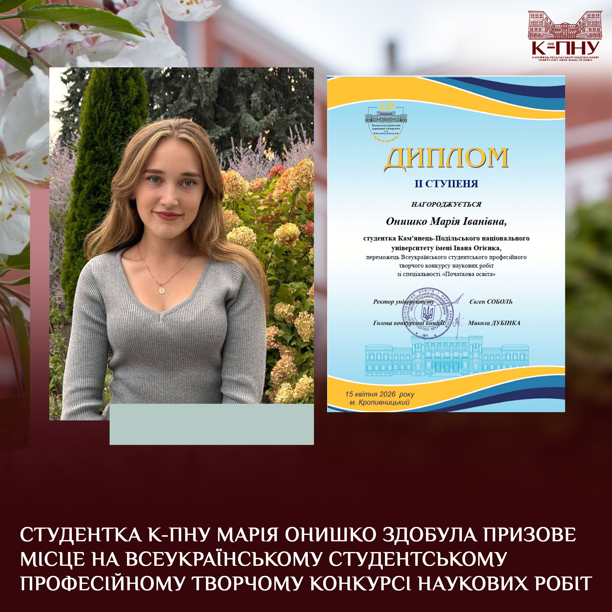 Студентка К-ПНУ Марія Онишко здобула призове місце на Всеукраїнському студентському професійному творчому конкурсі наукових робіт