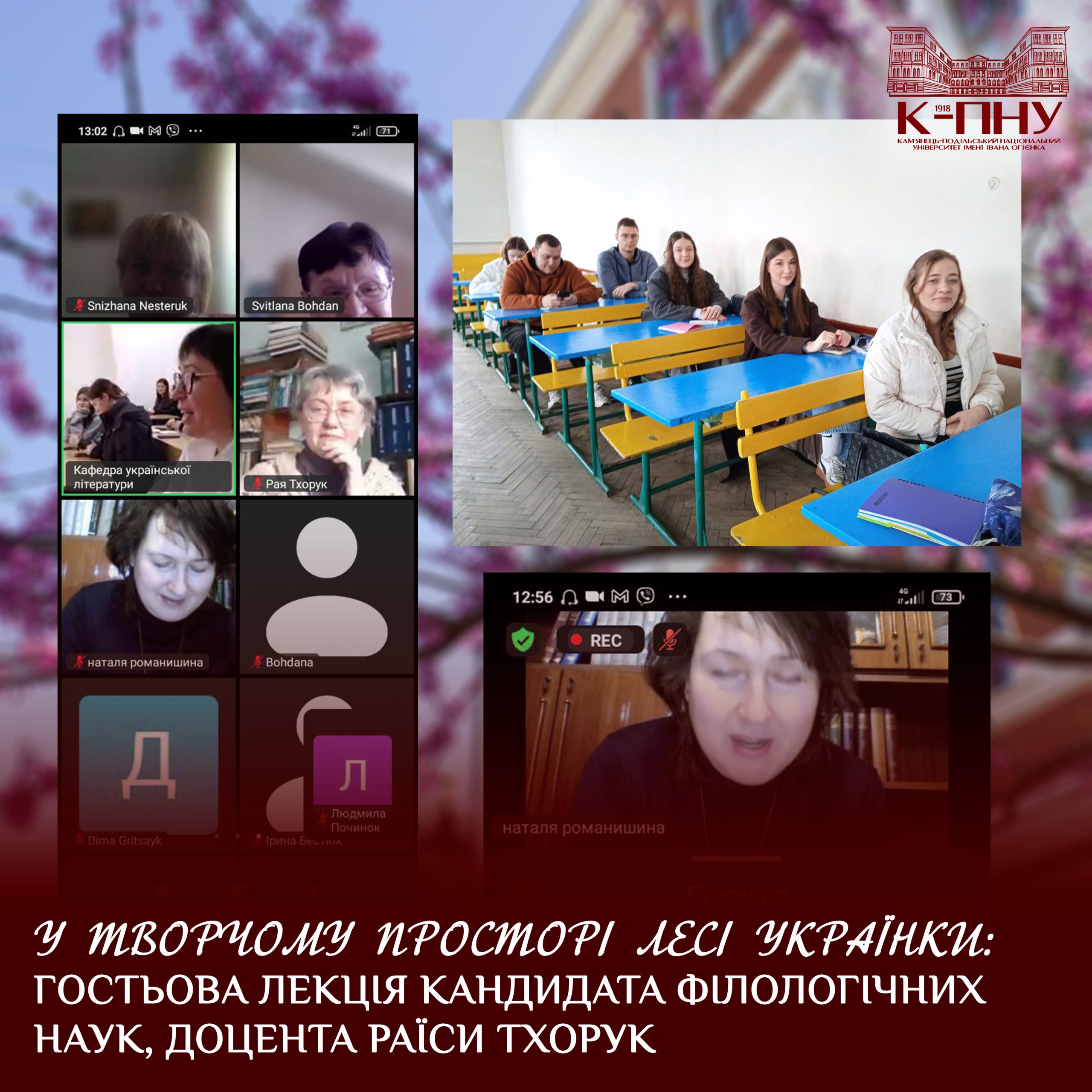 18 березня 2026 року здобувачі першого (бакалаврського) рівня вищої освіти 3 року навчання спеціальностей 014 Середня освіта (Українська мова і література), 014 Середня освіта (Українська мова і література. Англійська мова), 035 Філологія  (Українська мова і література) мали нагоду долучитися до гостьової лекції кандидата філологічних наук, доцента кафедри української та зарубіжної літератури Рівненського державного гуманітарного університету Раїси Тхорук «Осяйне зцілення з межі виснаження: про парадокси у світі “Йоганни, жінки Хусової” Лесі Українки».