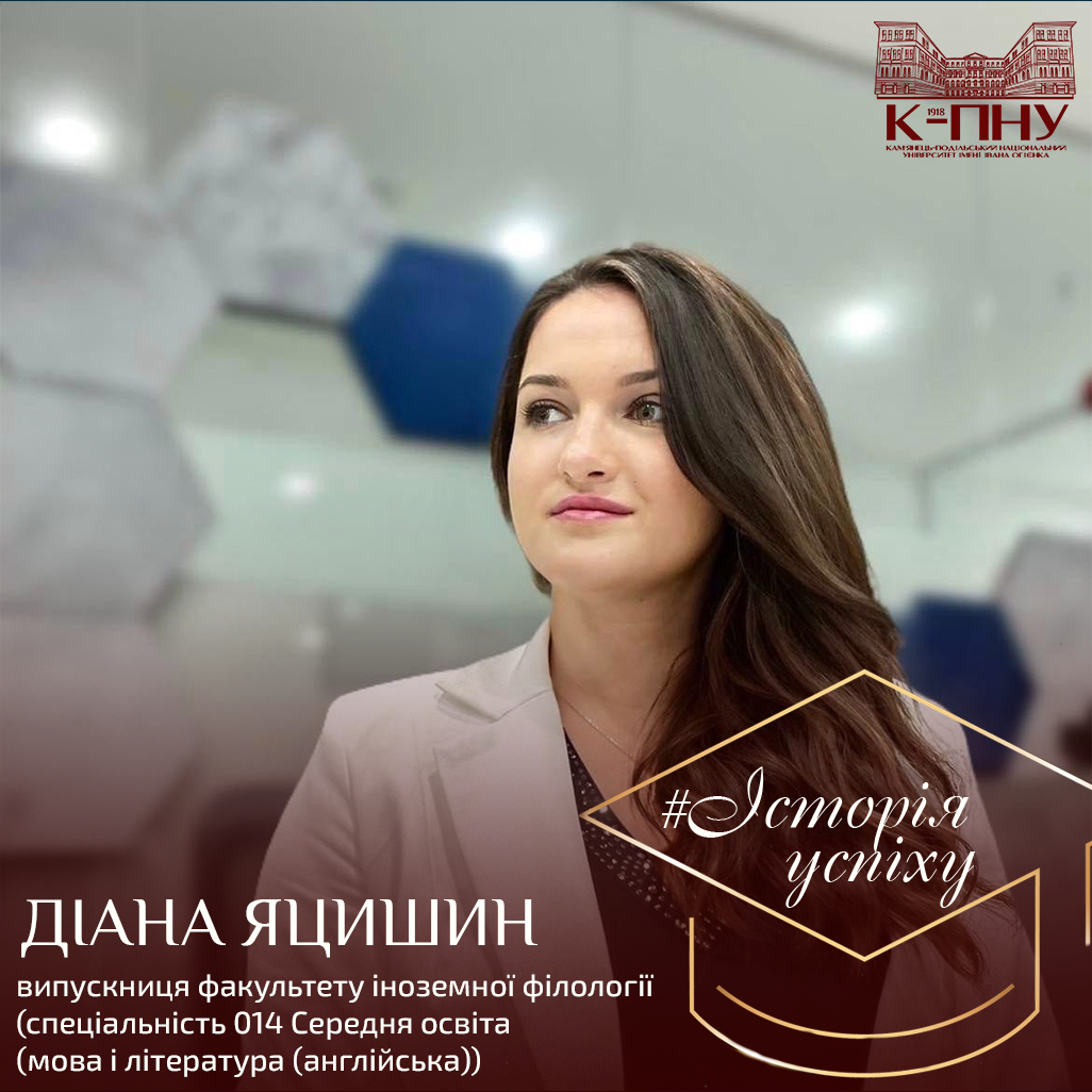 Діана Яцишин – випускниця факультету іноземної філології спеціальності 014 Середня освіта (мова і література (англійська)). Працює MSc Course Administrator в Academic Administration Office (відповідає за адміністративний процес магістрів, які навчаються за освітньою програмою «Mathematical and Theoretical Physics» в University of Oxford).