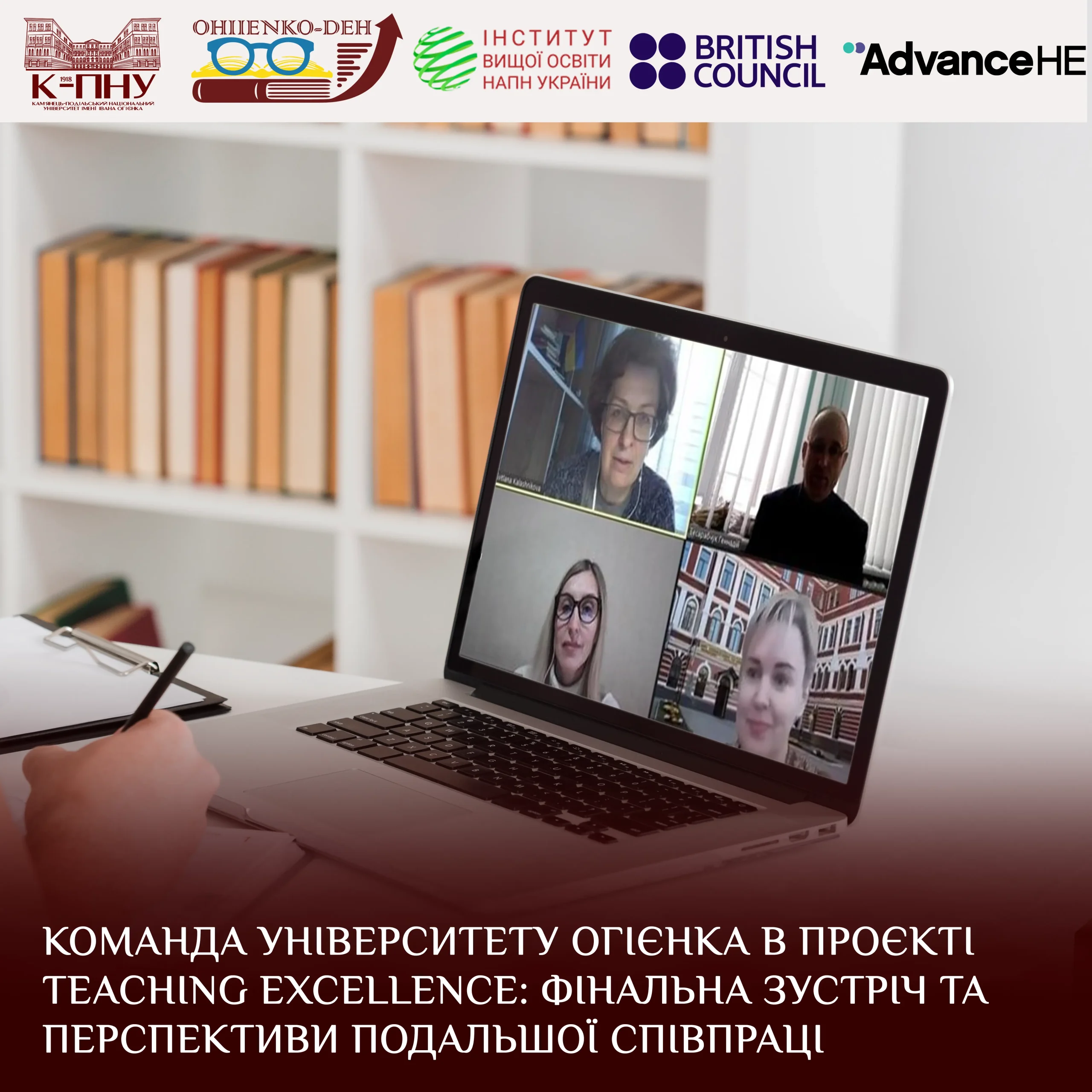 21 грудня 2022 р. у межах Програми вдосконалення викладання у вищій освіті, яка реалізується Британською Радою в Україні у партнерстві з Інститутом вищої освіти НАПН України, Advance HE (Велика Британія), відбулась фінальна зустріч команди Університету Огієнка (Геннадій Бесарабчук, керівник навчально-методичного центру забезпечення якості освіти, кандидат педагогічних наук; Тетяна Сторчова, керівник відділу міжнародних зв’язків, кандидат педагогічних наук, доцент; Наталія Мєлєкєсцева, кандидат філологічних наук; Андрій Хоптяр, кандидат історичних наук (перебуває в лавах ЗСУ)) зі Світланою Калашніковою, доктором педагогічних наук, професором, радником при дирекції Інституту вищої освіти НАПН України, національним координатором Проєкту.