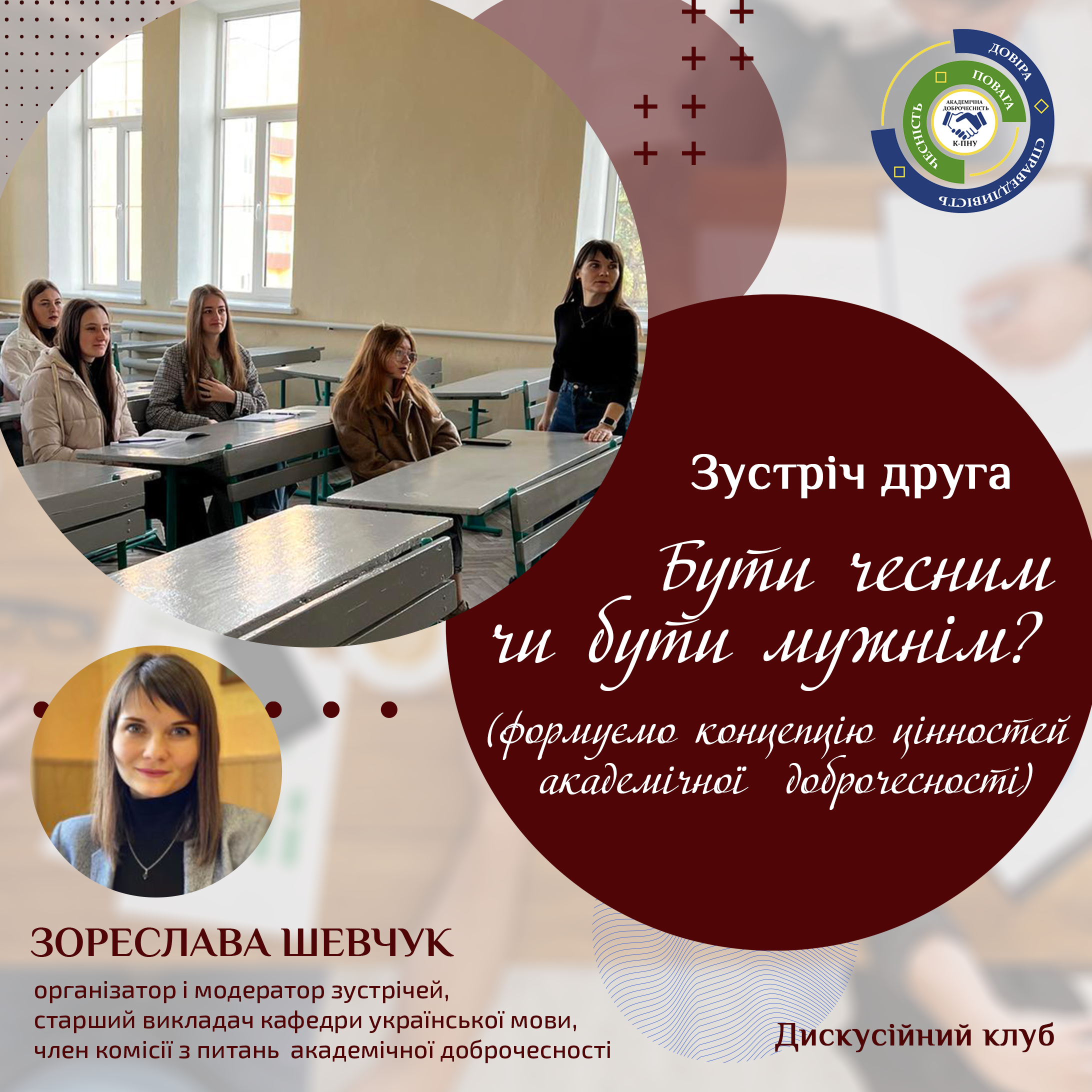 Спікер заходу – професор кафедри педагогіки та менеджменту освіти, доктор педагогічних наук, професор Ірина Кучинська. До роботи клубу залучили експертів: проректора з науково-педагогічної роботи та міжнародних зв’язків, доцента кафедри педагогіки та менеджменту освіти, кандидата педагогічних наук Геннадія Бесарабчука; професора кафедри політології та філософії, доктора політичних наук, професора Сергія Вонсовича; професора кафедри психології освіти, кандидата психологічних наук, професора Тетяну Дуткевич; завідувача доцента кафедри педагогіки та менеджменту освіти, кандидата педагогічних наук, доцента Світлану Поліщук. Читати далі
