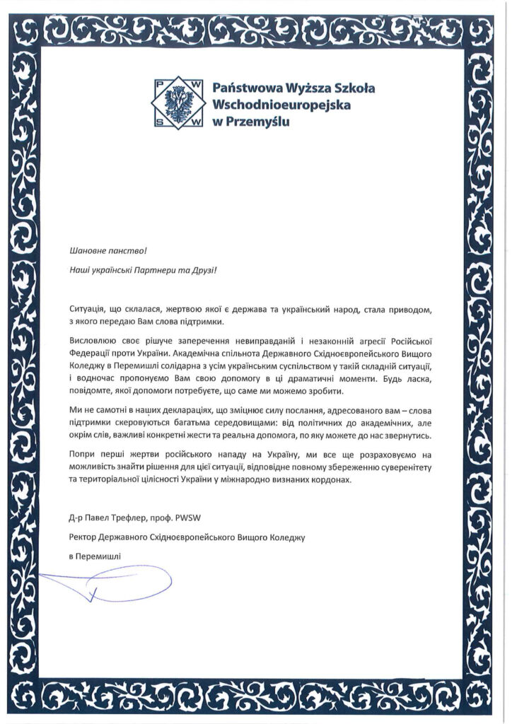 Звертаємося до вас із закликом виступити проти війни, обстоювати мир і безпеку наших народів! Сьогодні вирішується майбутнє не лише України, але всього цивілізованого світу! Разом ми переможемо!