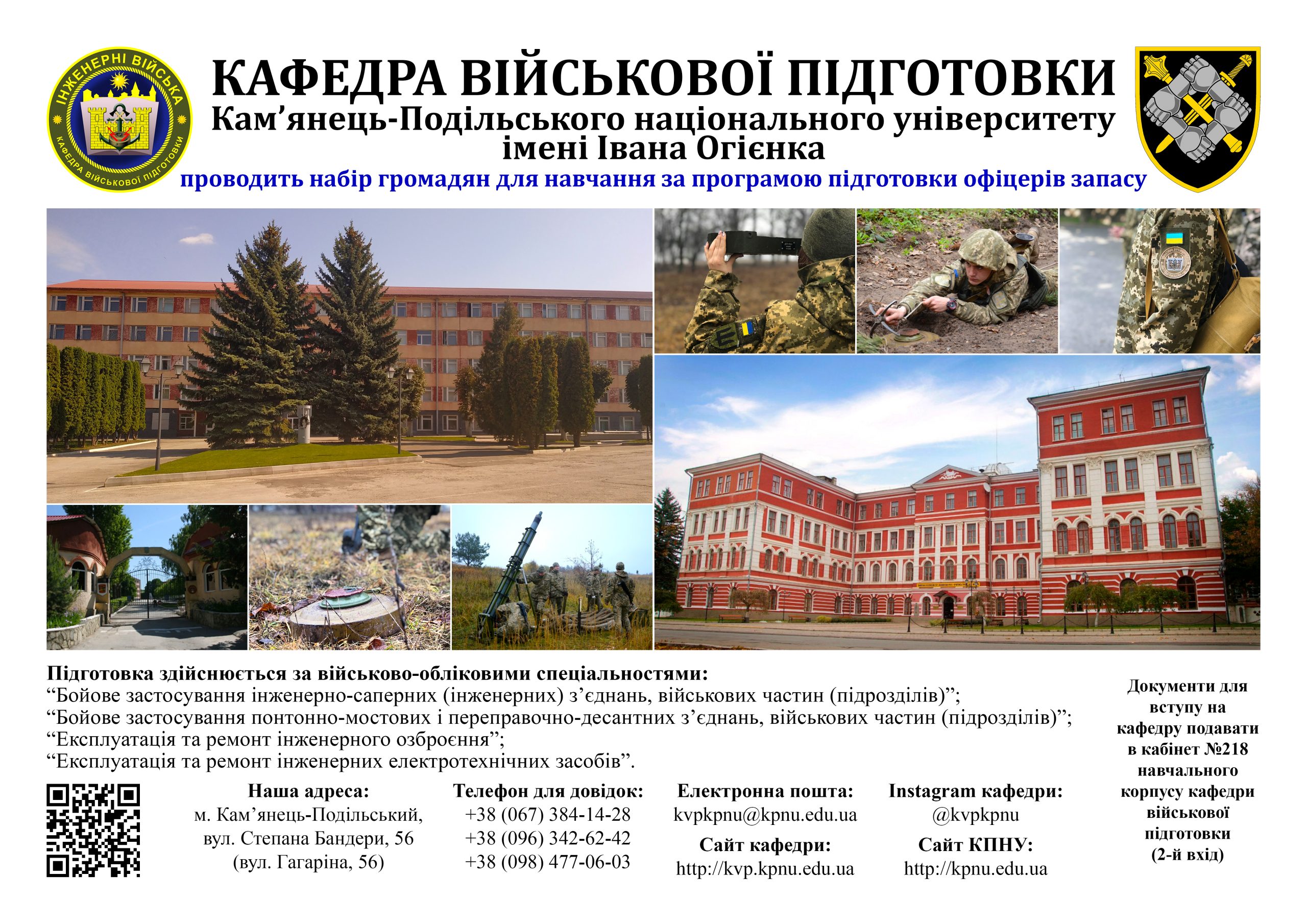 Кафедра військової підготовки К-ПНУ проводить набір громадян для навчання за програмою підготовки офіцерів запасу.