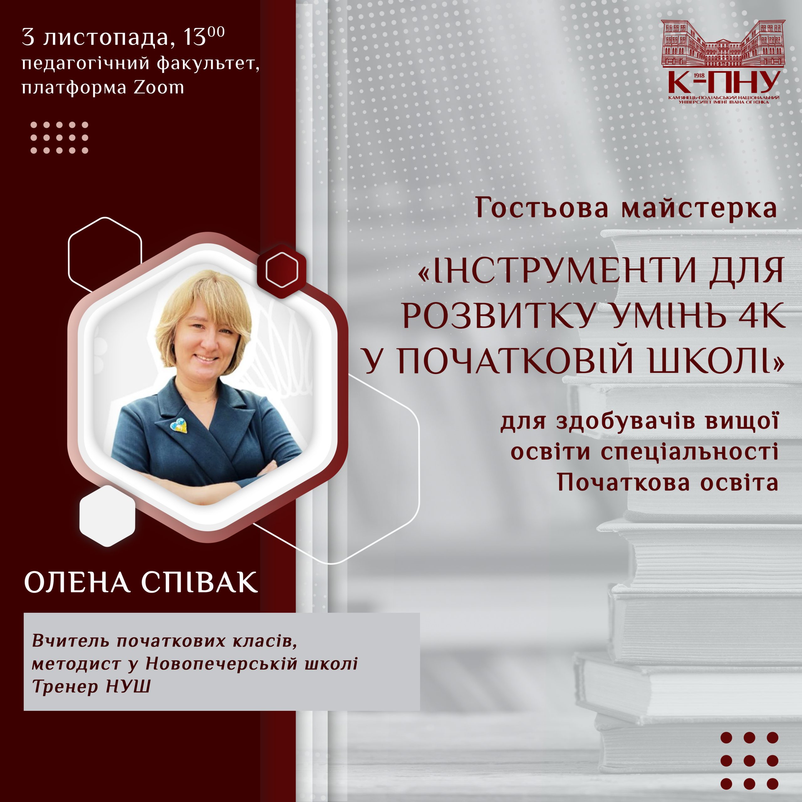 3 листопада о 13:00 (платформа ZOOM) відбудеться гостьова майстерка від учителя початкових класів, методиста в Новопечерській школі, тренера НУШ Олени Співак «Інструменти для розвитку умінь 4К у початковій школі» для здобувачів вищої освіти спеціальності Початкова освіта.