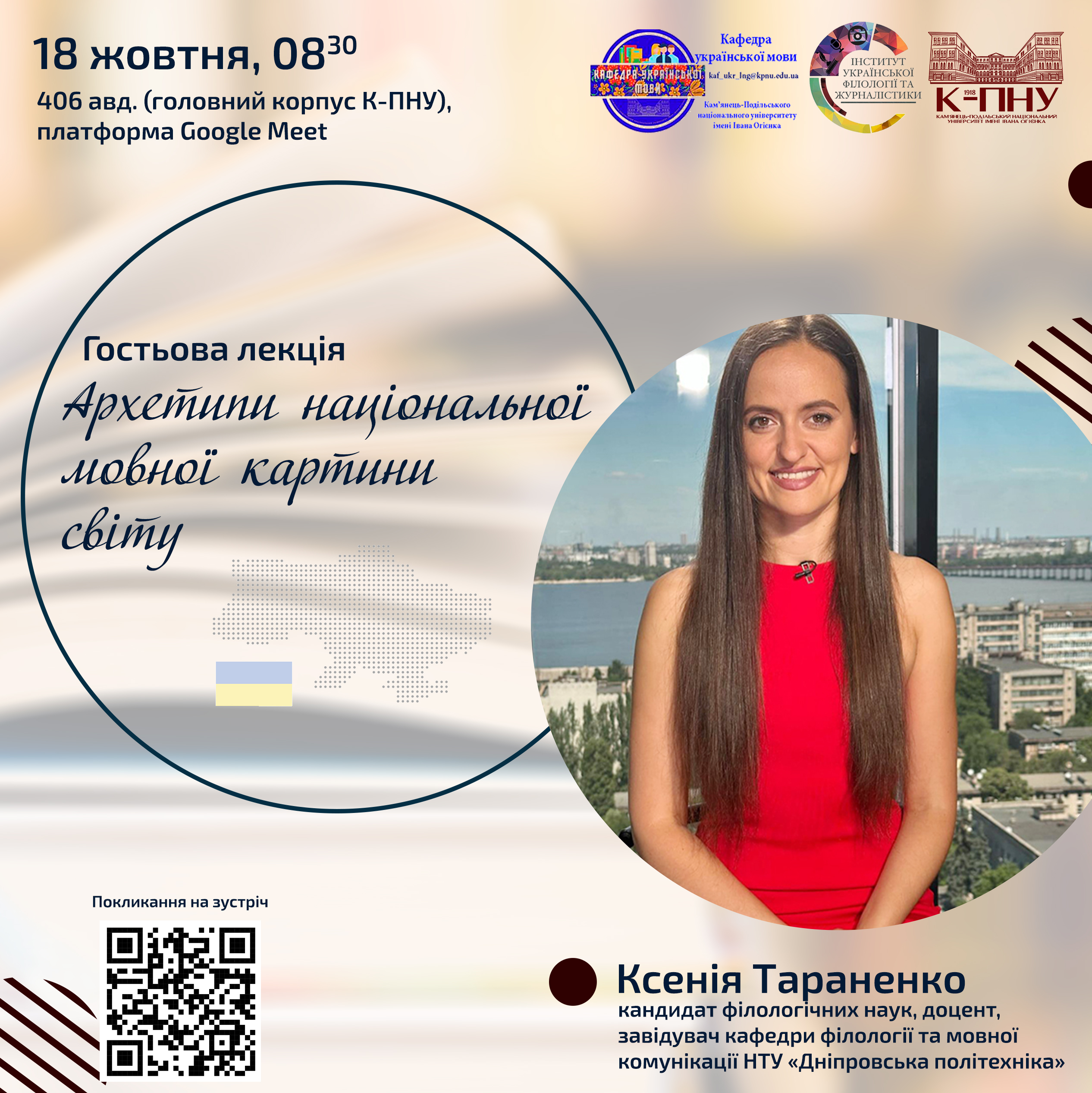 18 жовтня 2024 року відбудеться гостьова лекція кандидата філологічних наук, доцента, завідувача кафедри філології та мовної комунікації НТУ «Дніпровська політехніка» Ксенії Тараненко.