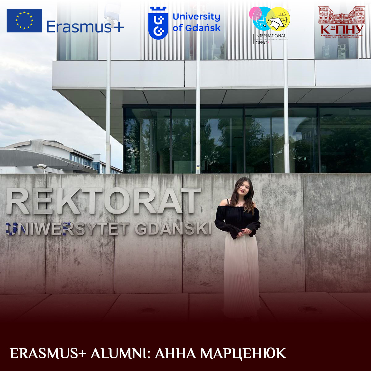 Анна Марценюк – студентка 2 курсу факультету іноземної філології спеціальності 014 Середня освіта (Мова і література (німецька), із 16 лютого до 18 червня 2024 р. навчалась у Гданському університеті (Республіка Польща), реалізуючи академічну мобільність за напрямом КА171: міжнародна кредитна мобільність у формі навчання.