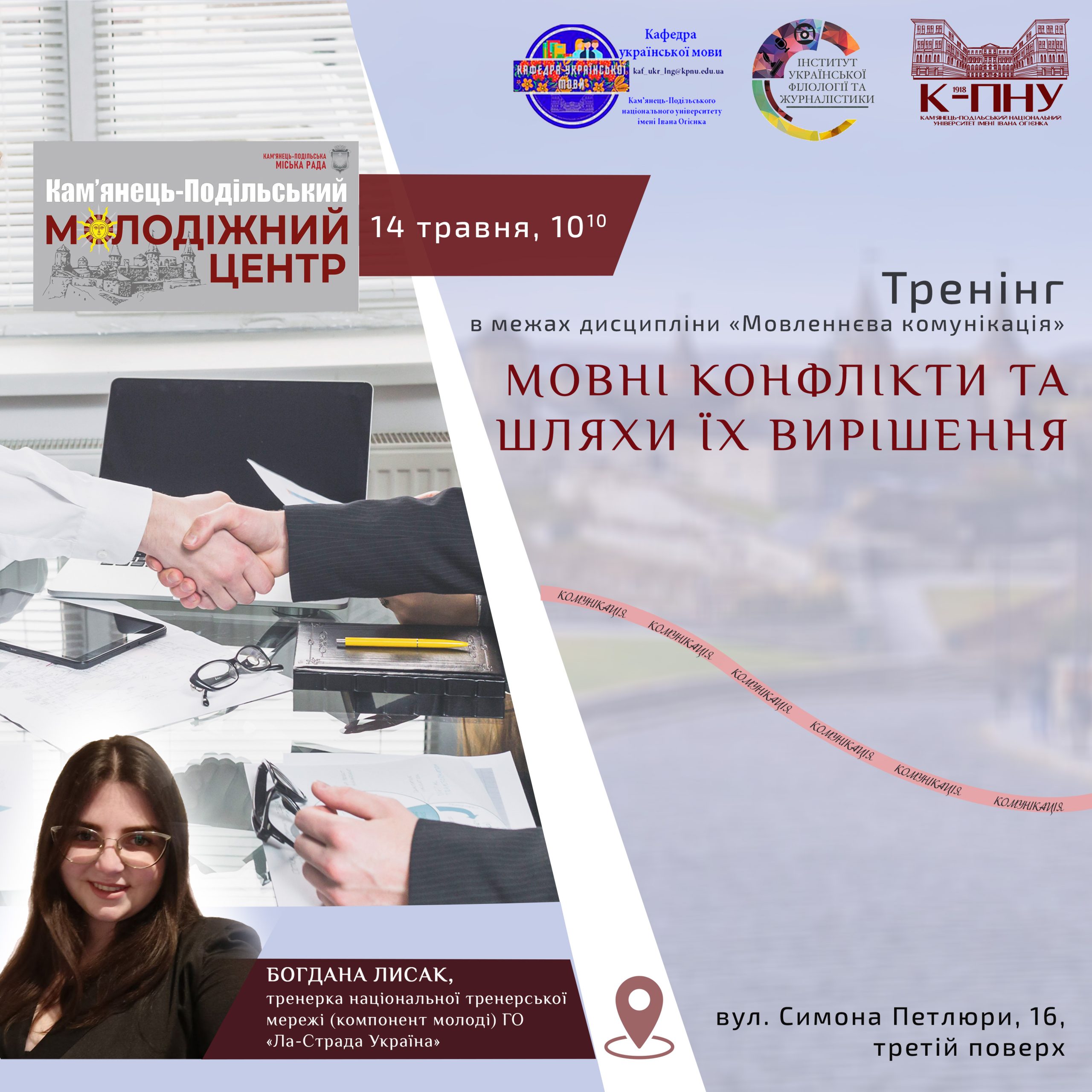 14 травня о 10:10 відбудеться тренінг «Мовні конфлікти та шляхи їх вирішення» в межах вивчення студентами навчально-наукового інституту української філології та журналістики К-ПНУ 2-3 курсів дисципліни «Мовленнєва комунікація».
