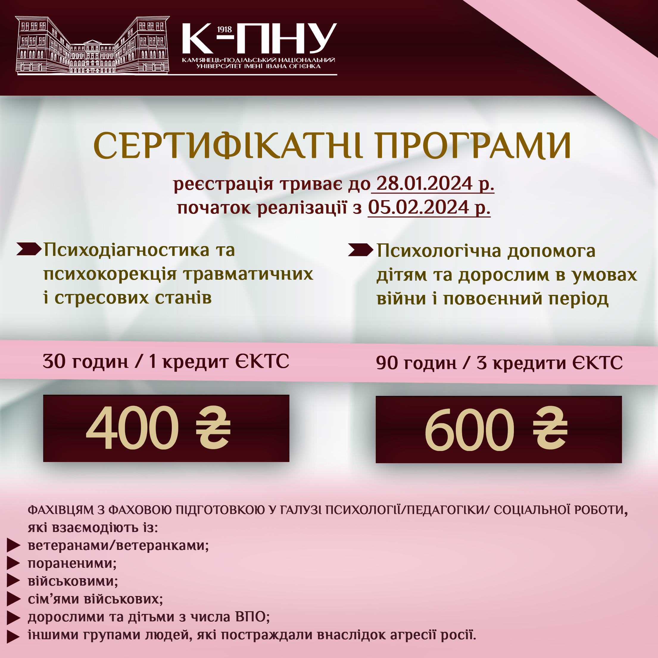 Якщо ви практичний психолог, соціальний педагог або представник допоміжної професії, яка передбачає взаємодію з ветеранами, пораненими, військовими, сім’ями військових, дорослими і дітьми з числа ВПО та іншими групами людей, які постраждали внаслідок агресії росії, то ця пропозиція саме для вас.