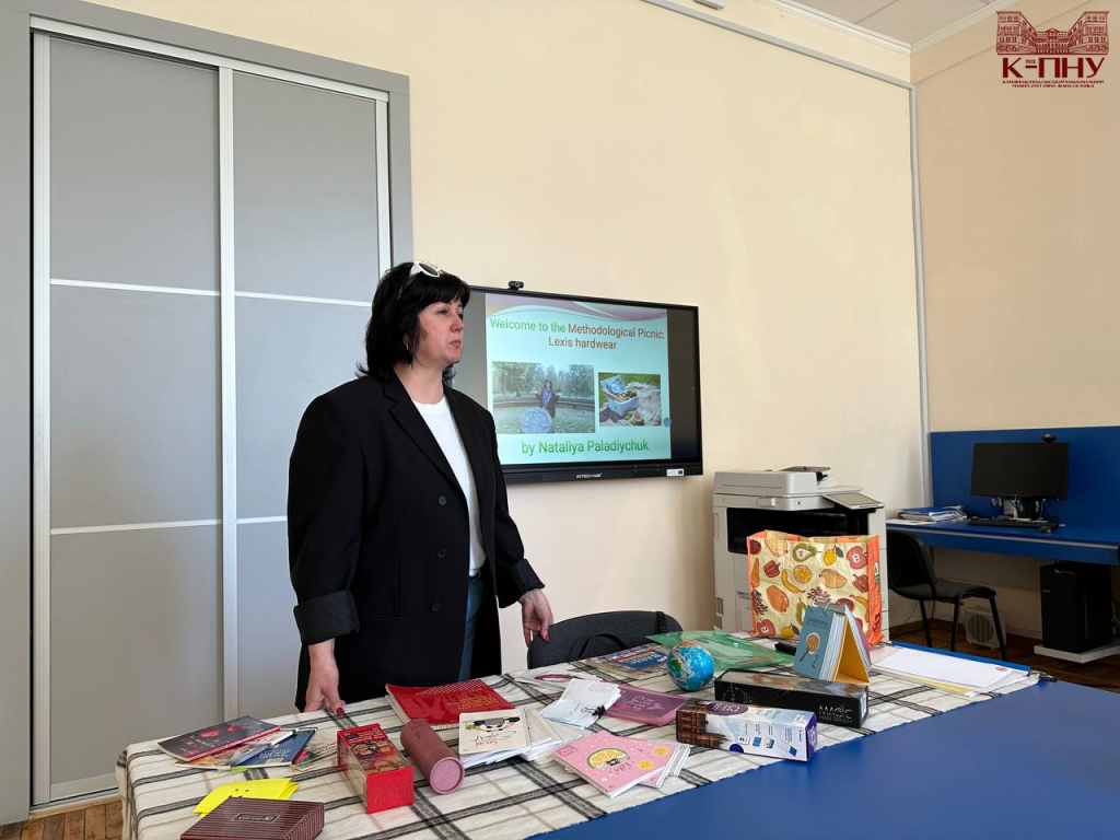 Цього разу майстерка була неординарною за форматом і змістом – методичний пікнік! Своїм досвідом навчання лексики на уроках іноземної мови зі здобувачами вищої освіти факультету іноземної філології поділилася вчитель англійської мови Кам’янець-Подільського ліцею Наталія Паладійчук.